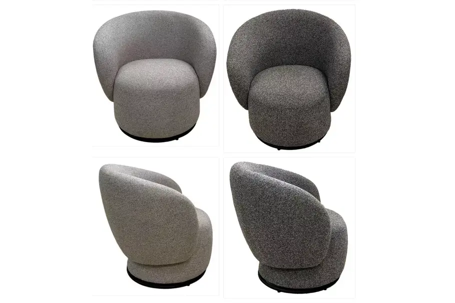 Loungesessel mit Strukturgewebe. Getragen von einer Bodenplatte in Metall schwarz matt, pulverbeschichtet. Drehbar bis 360°C. Erhältlich in anthrazit oder beige.