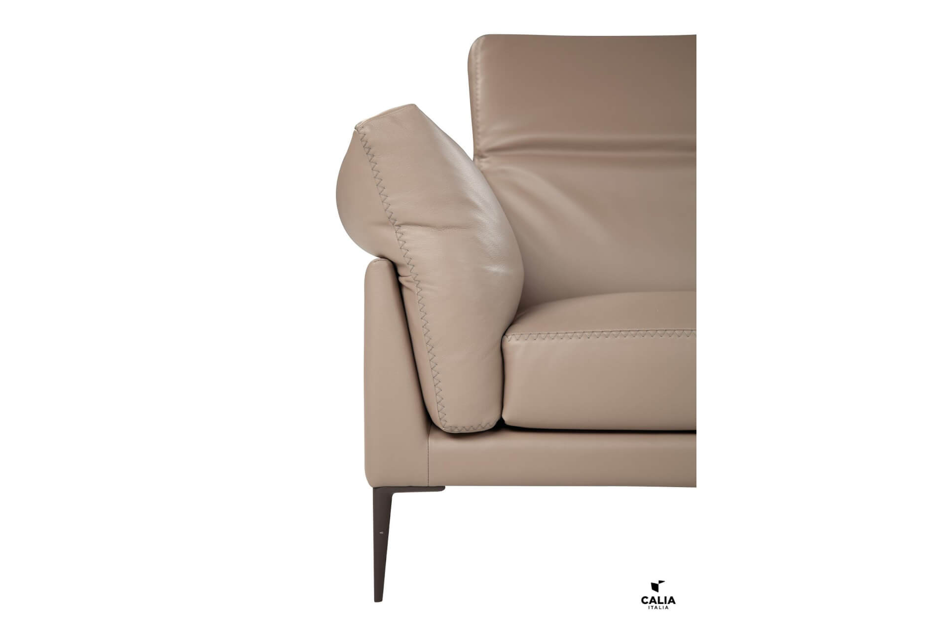 Die Schönheit dieses Sofas entsteht aus dem Kontrast von weichen Formen, die auf strengen, dünnen Metallfüßen stehen, während eine besonders dekorative Naht das Design betont. Ein Mechanismus innerhalb des Rückens, der die Rückenhöhe vergrößert sorgt für einen besonderen Komfort.