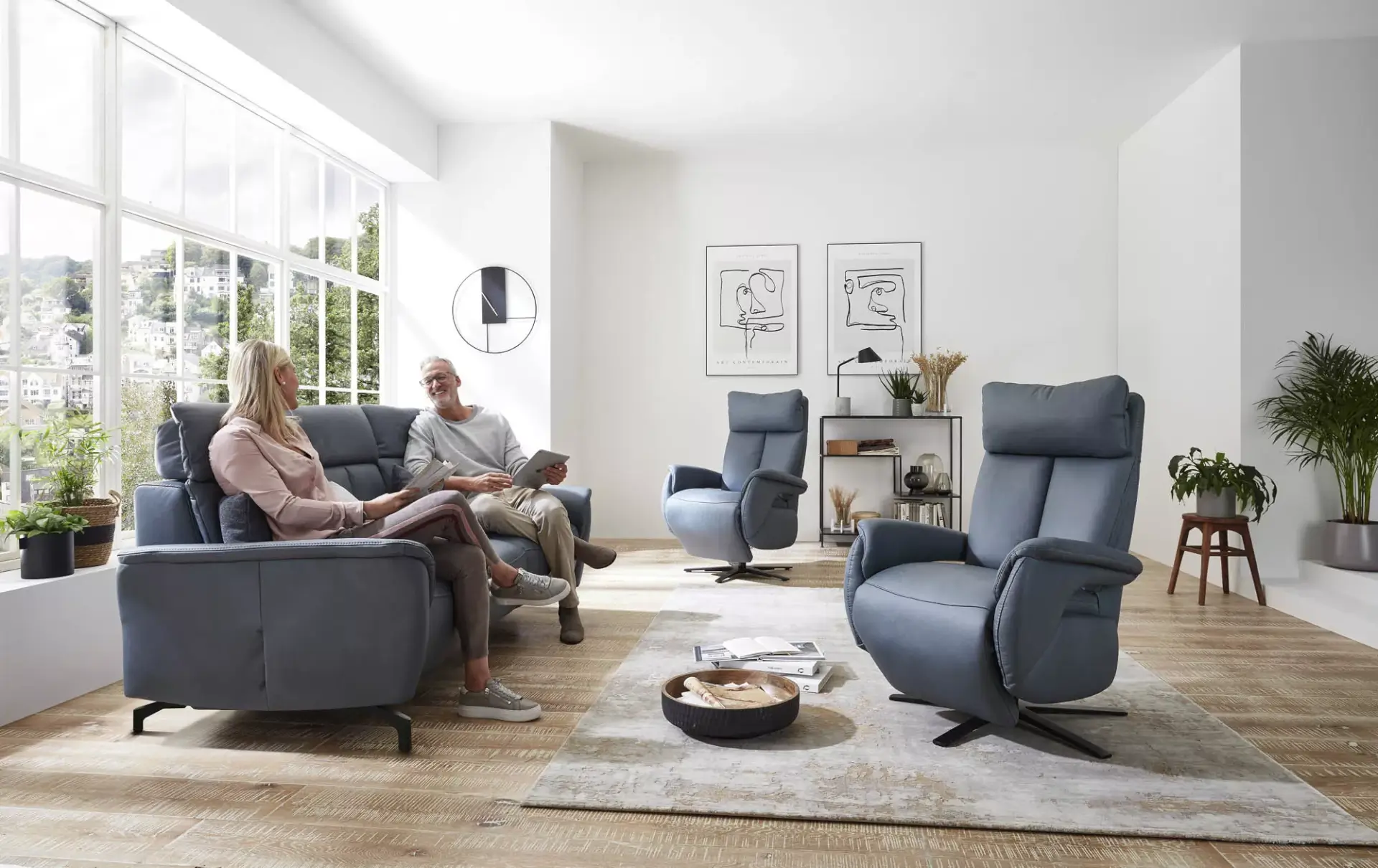 Stylische Polstergarnitur mit vielen Details. Auf Wunsch mit notorischen Relaxfunktionen, Kopfteilverstellung, TV-Funktion motorisch, Tischfunktion, Sitzvorzug.......