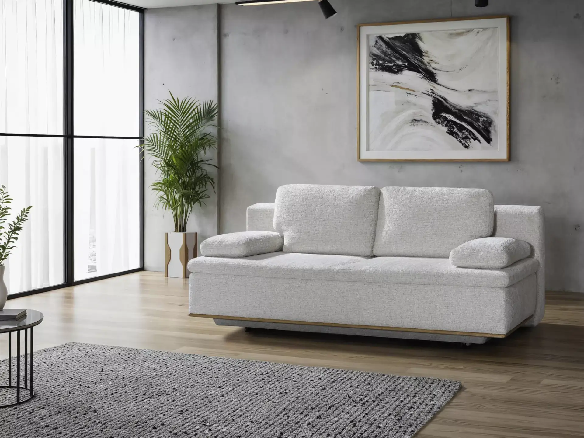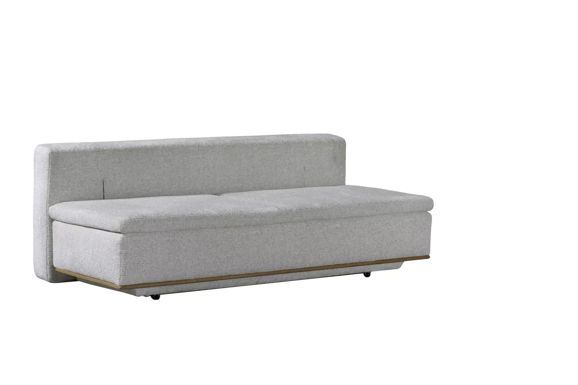 Querschläfer mit Bettkasten und einem Federkernsitz bei einer Liegefläche von 160 x 205 cm. Durch Vorziehen der Sitzfläche und Herunterklappen des Rückenteils entsteht eine Doppelliege. Schlafen auf Sitzhöhe.
