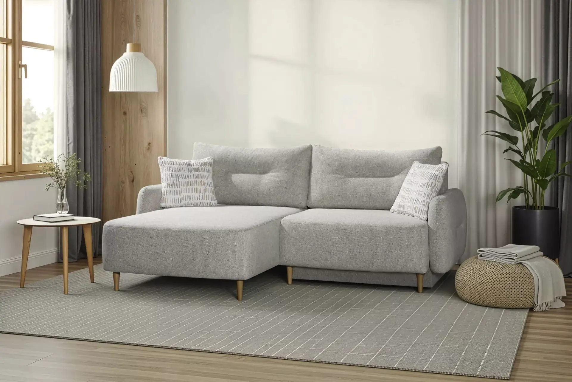 Wohn-Schlafsystem mit einer Ecke fest, mit Ottomane links/rechts und der zweiten Ecke rechts/links mit Schlaffunktion. Liegefläche 140 x 200 cm. Die Liegefläche entsteht durch Vorziehen des Sitzes und Umklappen der Rückenlehne. Zusätzliches Highlight der geräumige Bettkasten.