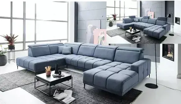 Wohnlandschaft mit Umbauecke,Typ 003, strapazierfähiger Bezug in grau, Storm 97 (PG4), Metallfüße schwarz matt, Polsterung Nosagunterfederung und Federkern, inkl. 1 manuellen Sitztiefenverstellung, elektrischer Sitztiefenverstellung (30cm), 5 Kopfteilverstellungen und 3 Kissen, Schenkelmaß ca. 230 x 317 cm, Sitzhöhe ca. 44 cm, Ottomanenbreite ca. 134 cm.