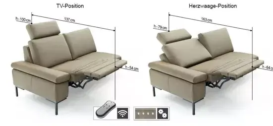 Moderne Sofalandschaft in verschiedenen Sitzausführungen, zwei Sitztiefen, unterschiedlichen Armlehnenvarianten und motorischen Relaxfunkionen.