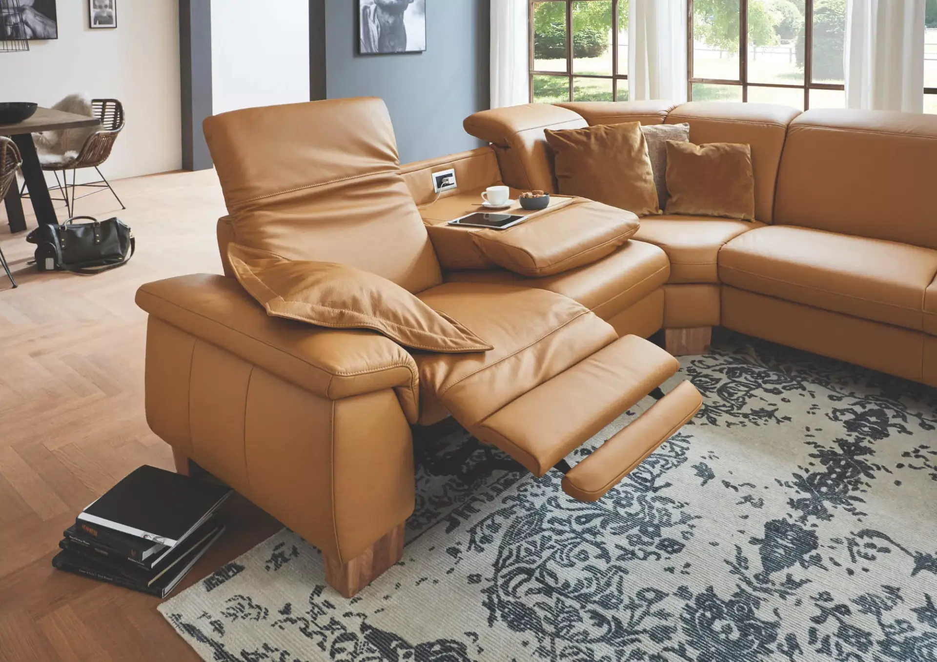 Schöne Polstergarnitur in Leder Puch, hier Farbe Curry ohne Kontrastnaht mit Kopfteilverstellung und motorischen Relaxfunktionen. Stellmaß: 279 x 245 cm