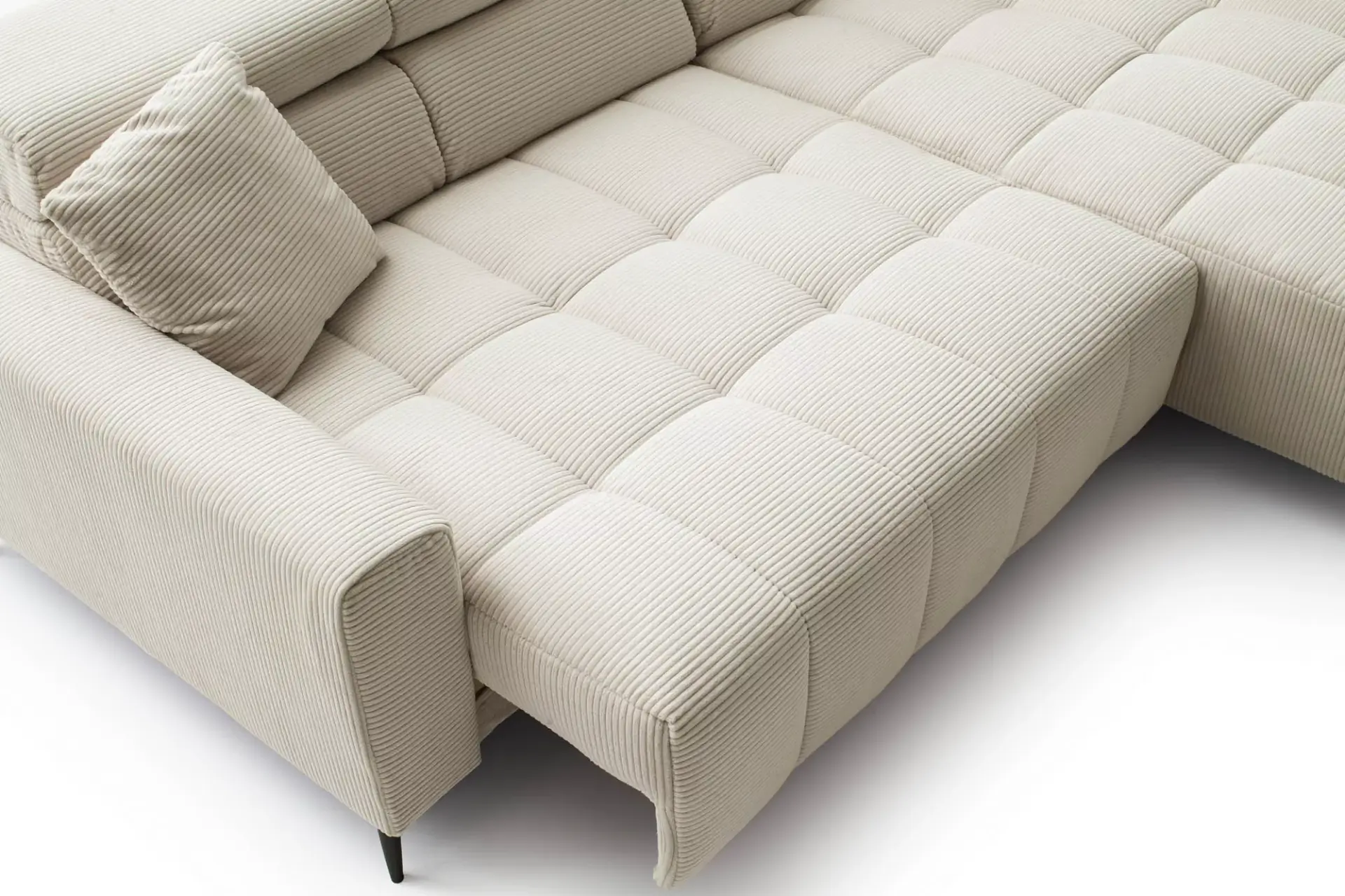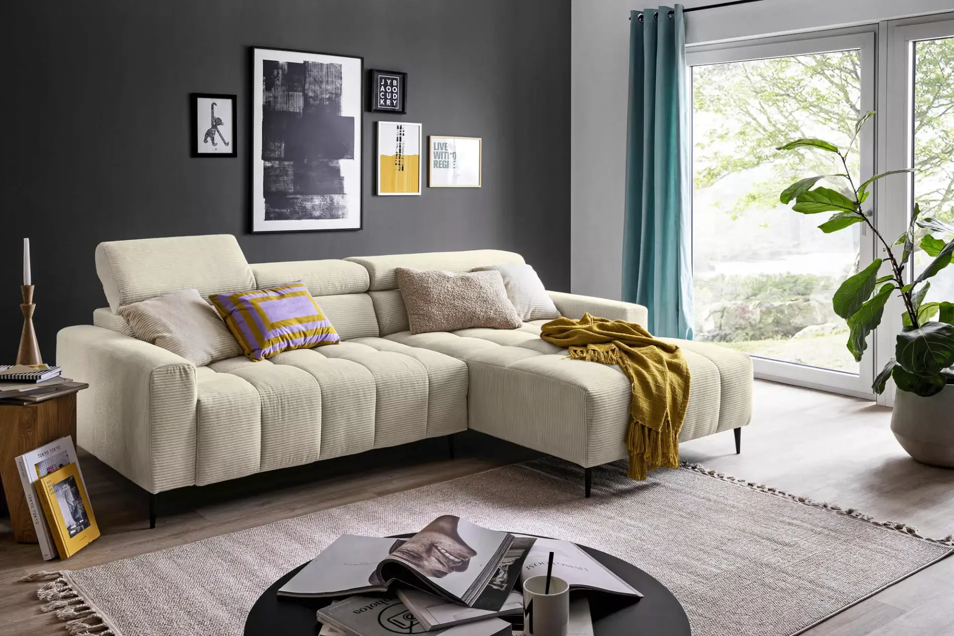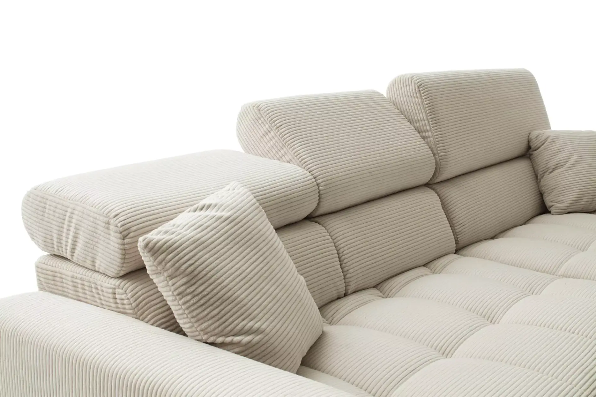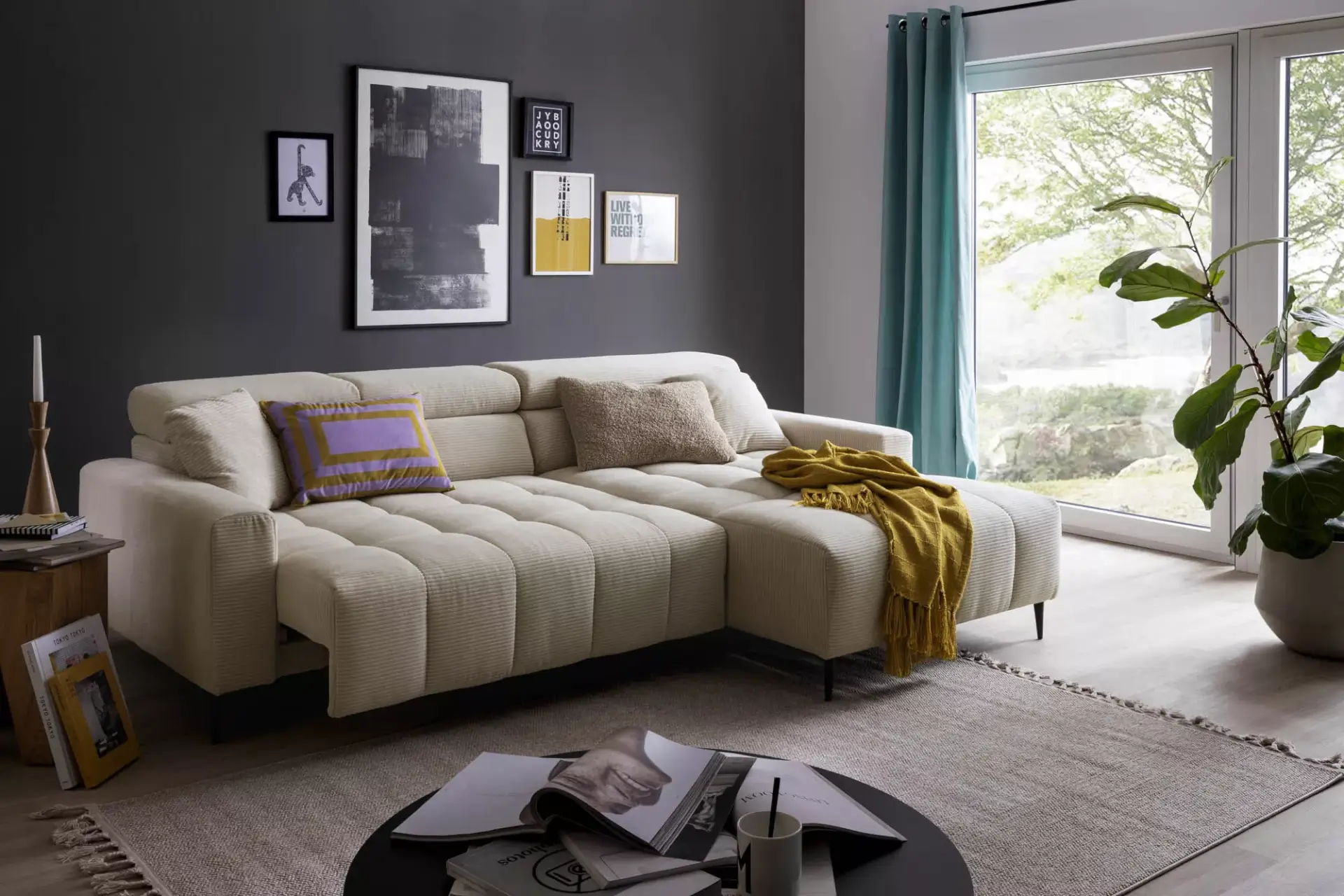 Brandneue Polstergarnitur mit Bezugsstoff Cord beige Hydra 23 (PG1), Nosagunterfederung, Polyätherschaumpolsterung, Metallfüße schwarz gepulvert, elektrische Sitztiefenverstellung, 3 manuelle Kopfteilverstellungen, inklusive 2 mittlere Kissen, Schenkelmaß ca. 256x180 cm, Liegefläche ca. 93x221cm, Sitztiefe ca. 93/66cm (ohne/mit Kissen), Sitzhöhe ca. 45cm, auch seitenverkehrt erhältlich.