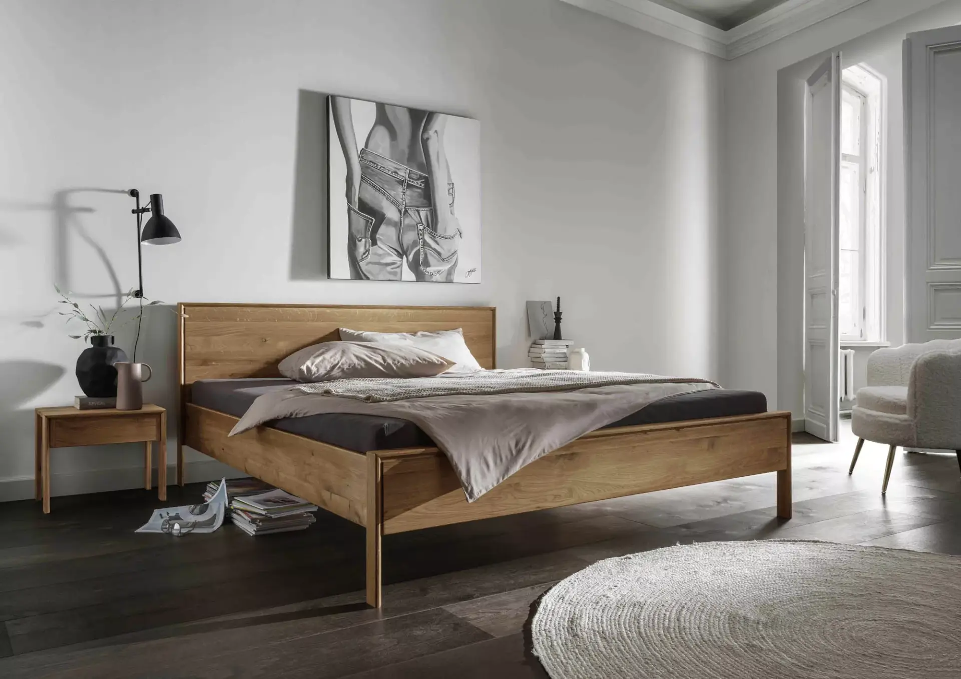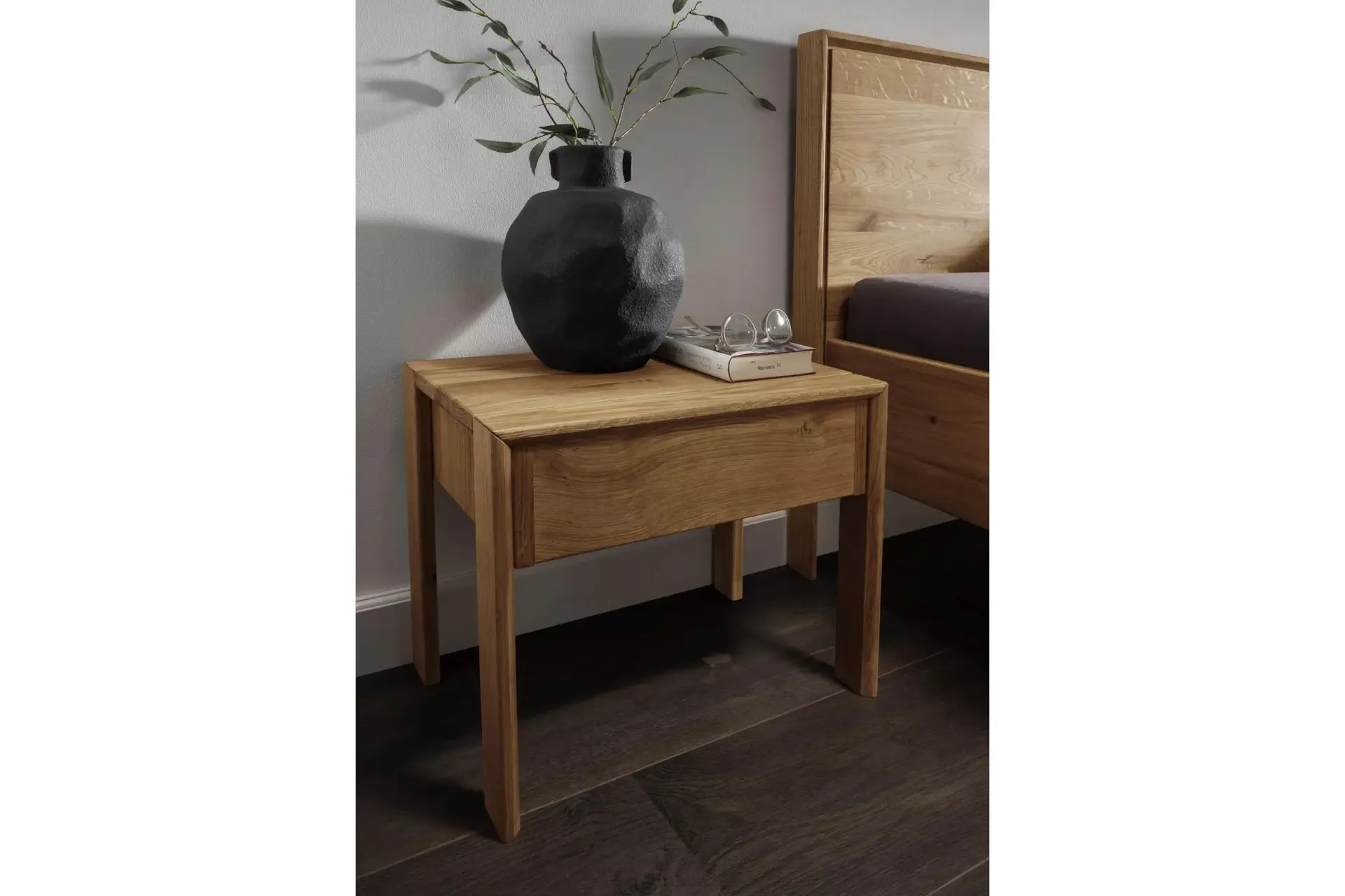 Geradliniges, edel aussehendes Bett mit freistehender Nachtkommode aus Wildeiche.