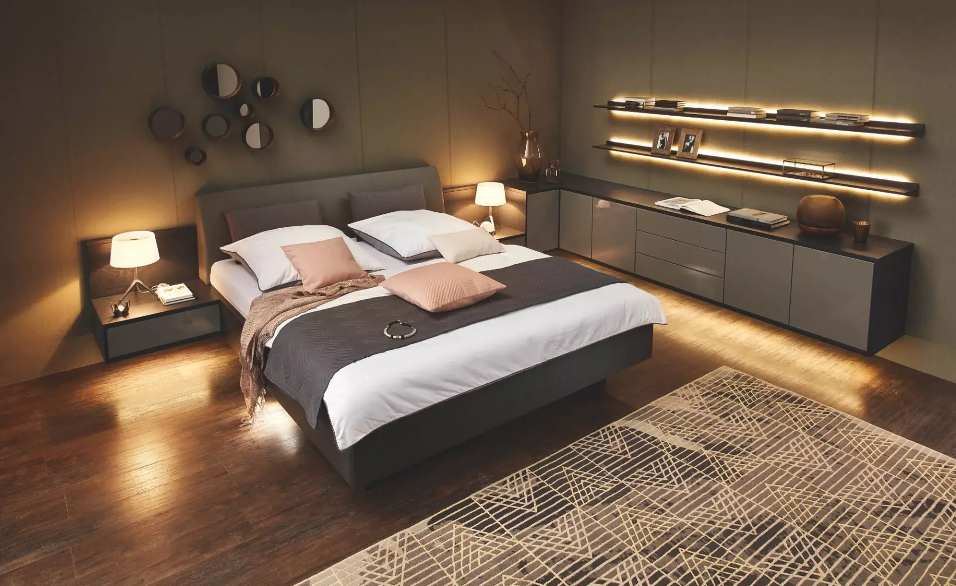 Ihr neues Schlafzimmer sorgt für ein angenehmes, komfortables und schönes Ambiente. Grifflose Fronten, ein dünner Rahmen und vieles mehr unterstützen eine avantgardistische Einrichtung mit einem puristischen Charakter. Eine außergewöhnliche Kombinationsvielfalt, wie der optimale Einsatz von Griffen, markanten Füßen und die Auswahl an unterschiedlichen Oberflächen und Materialien werden Sie in unserem Typenplan begeistern.