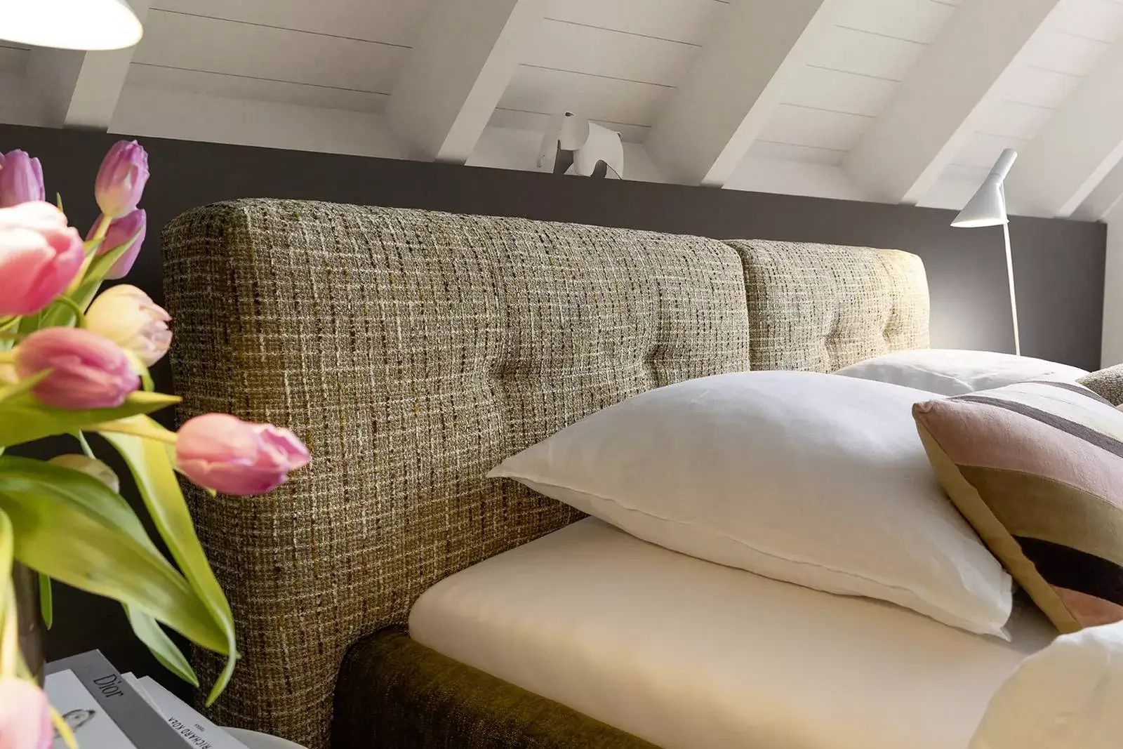 Dies wunderschöne Polsterbett bringt Sie in eine harmonische Balance, ein Rückzugsort mit einer klaren Formensprache. Die zeitlose Silhouette fügt sich in das Raumgefühl jedes Schlafzimmers ein. Ihr neuer Lieblingsplatz.
