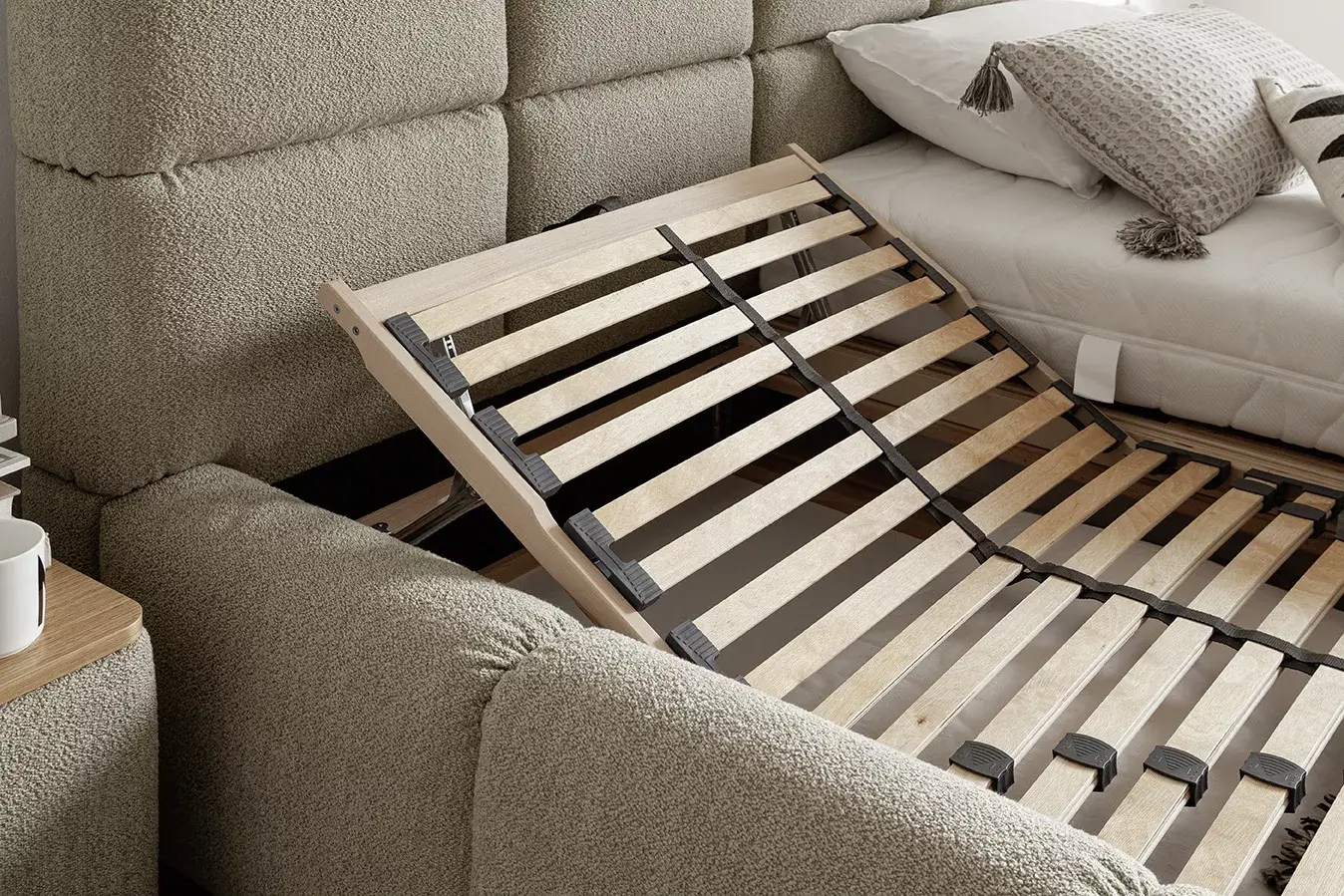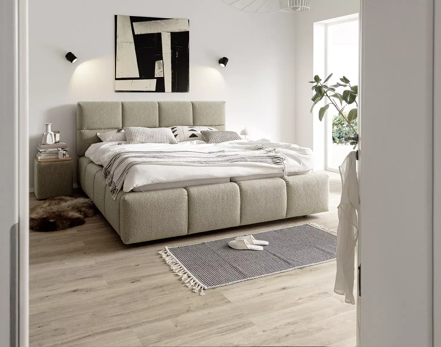 Mit der imposanten Waffeloptik setzt SAMBA klare Akzente und verleiht dem raum eine moderne und gemütliche Ausstrahlung. Dieses raffinierte Design wird von dem praktischen Stauraumfach ergänzt. Das Bett als Blickfang, mit praktischer Funktion.