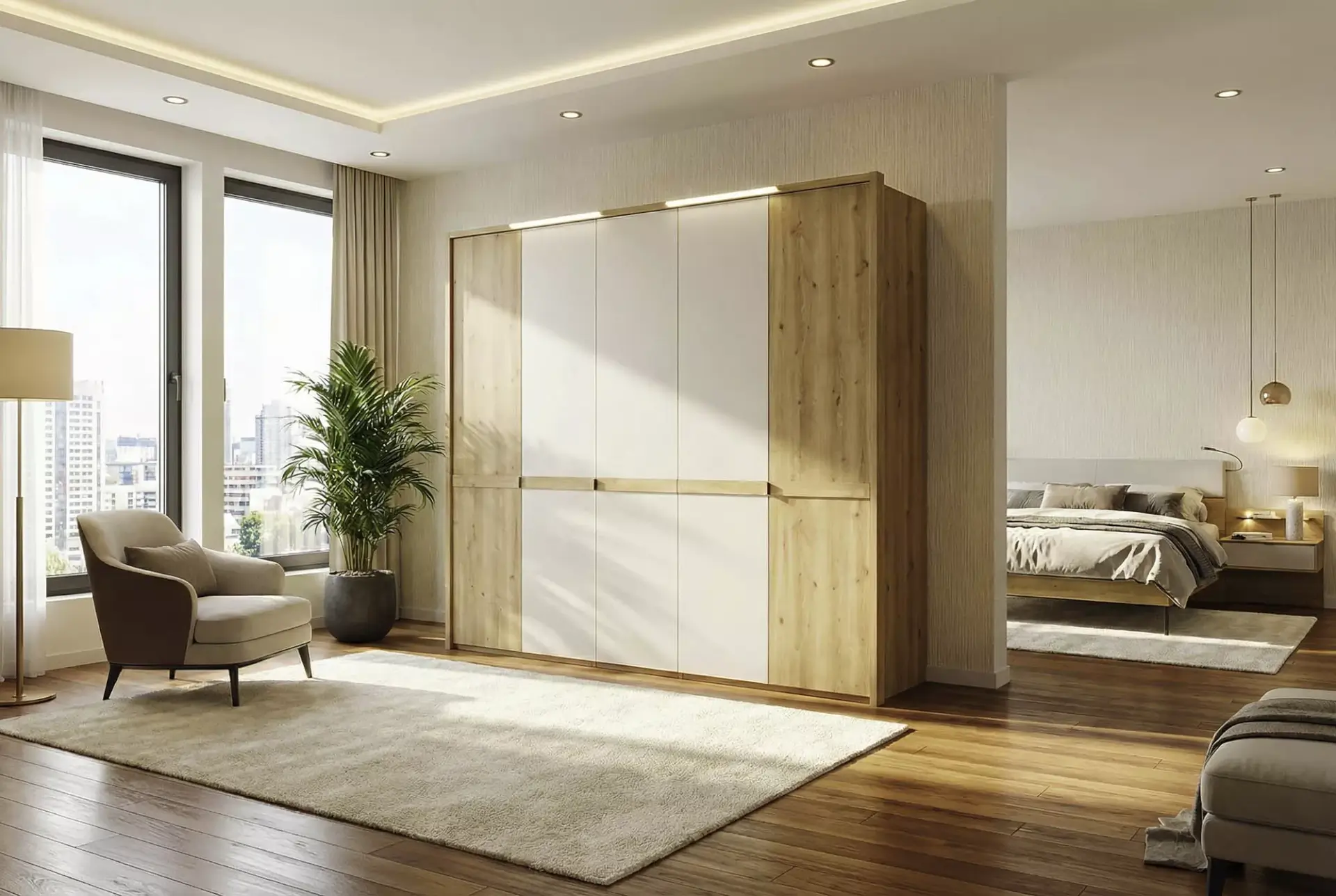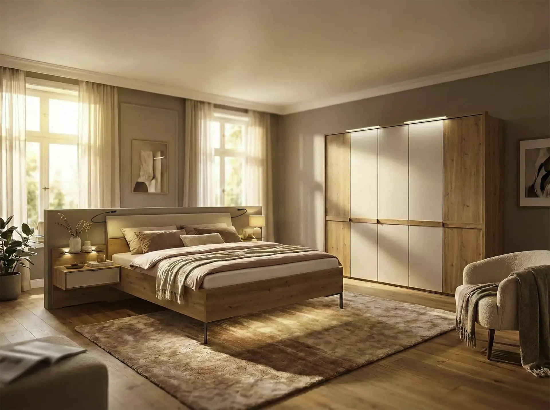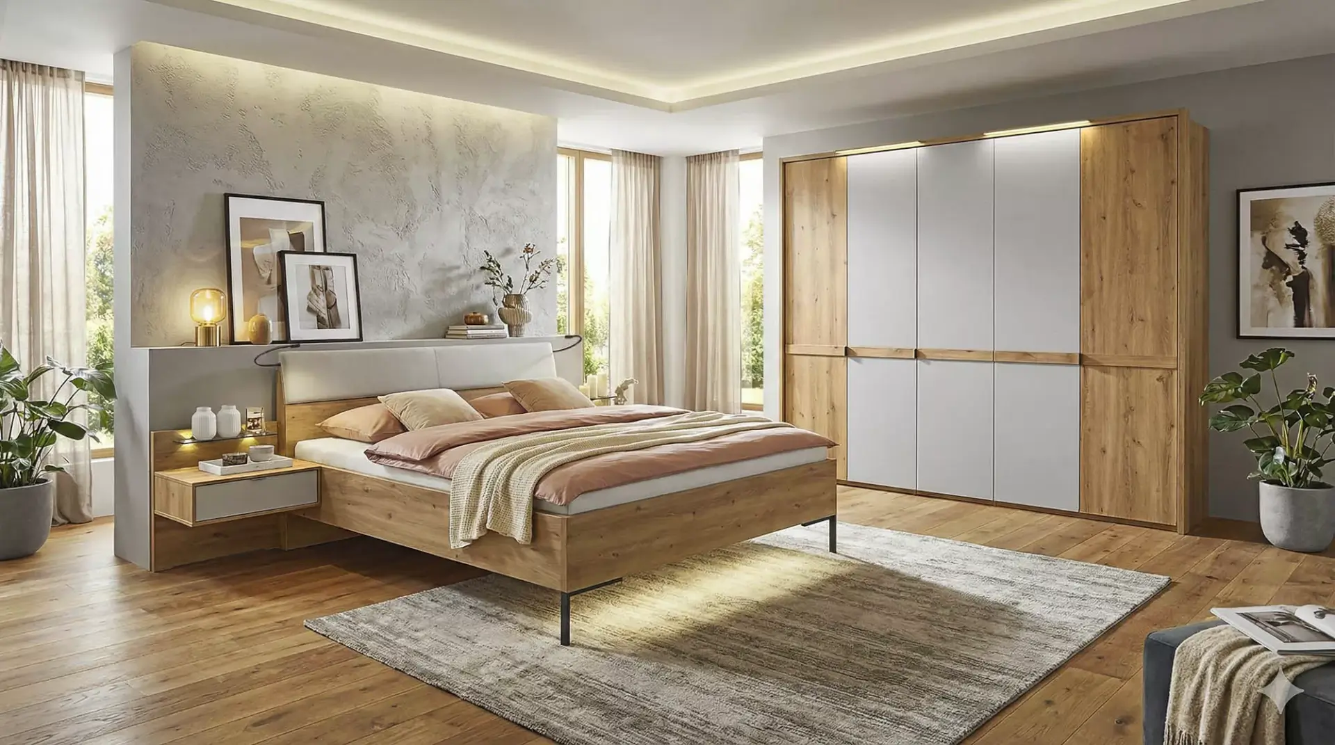 Zeitgemäßes, modernes Schlafzimmer in Farbausführung Bianco-Eiche-Nachbildung mit Absetzungen in Champagner-Dekor.
