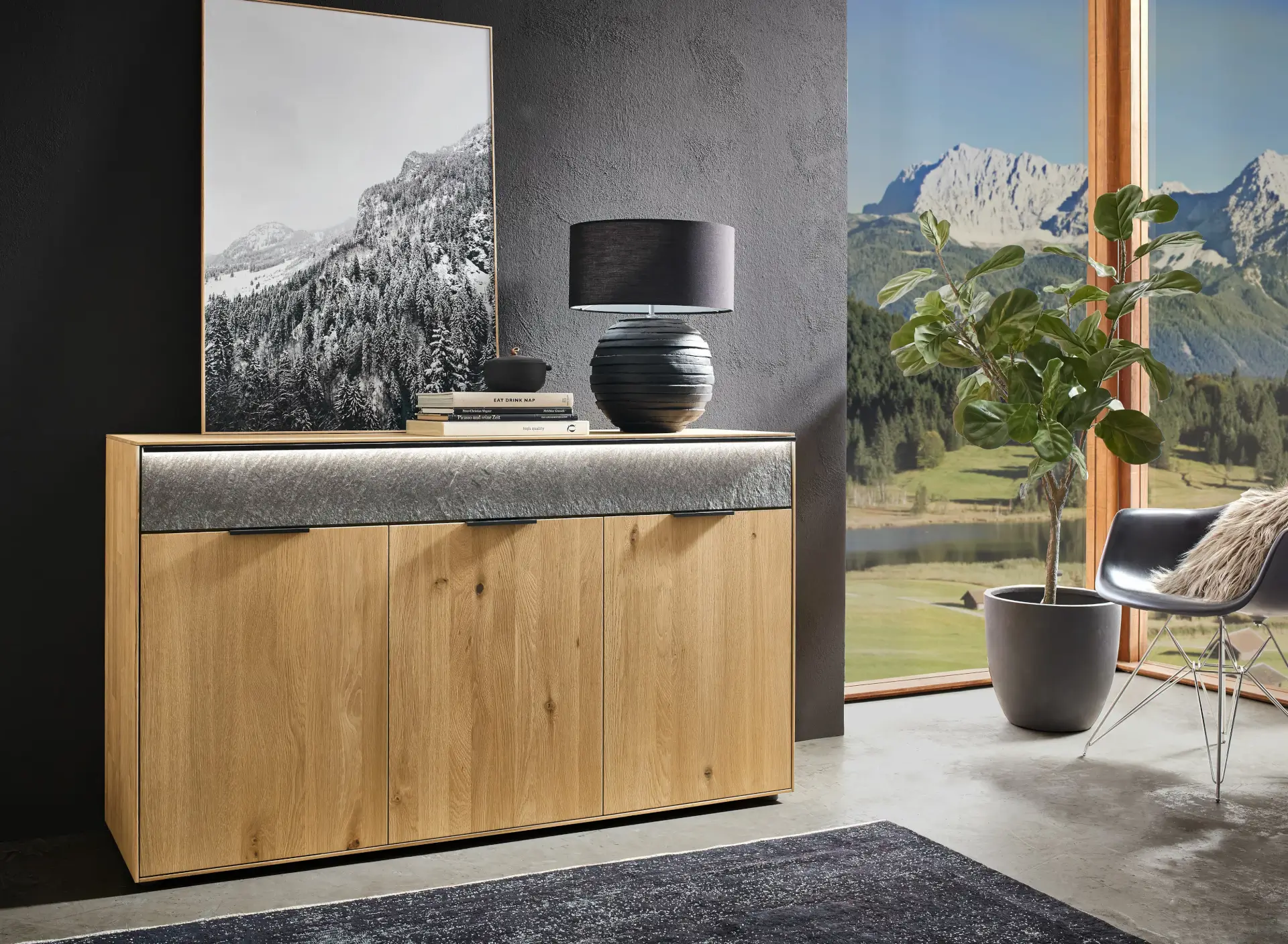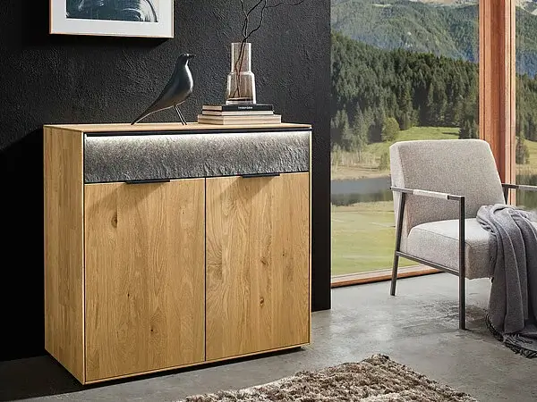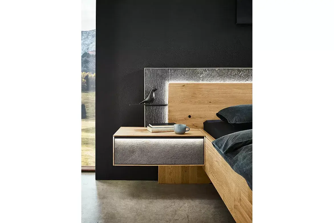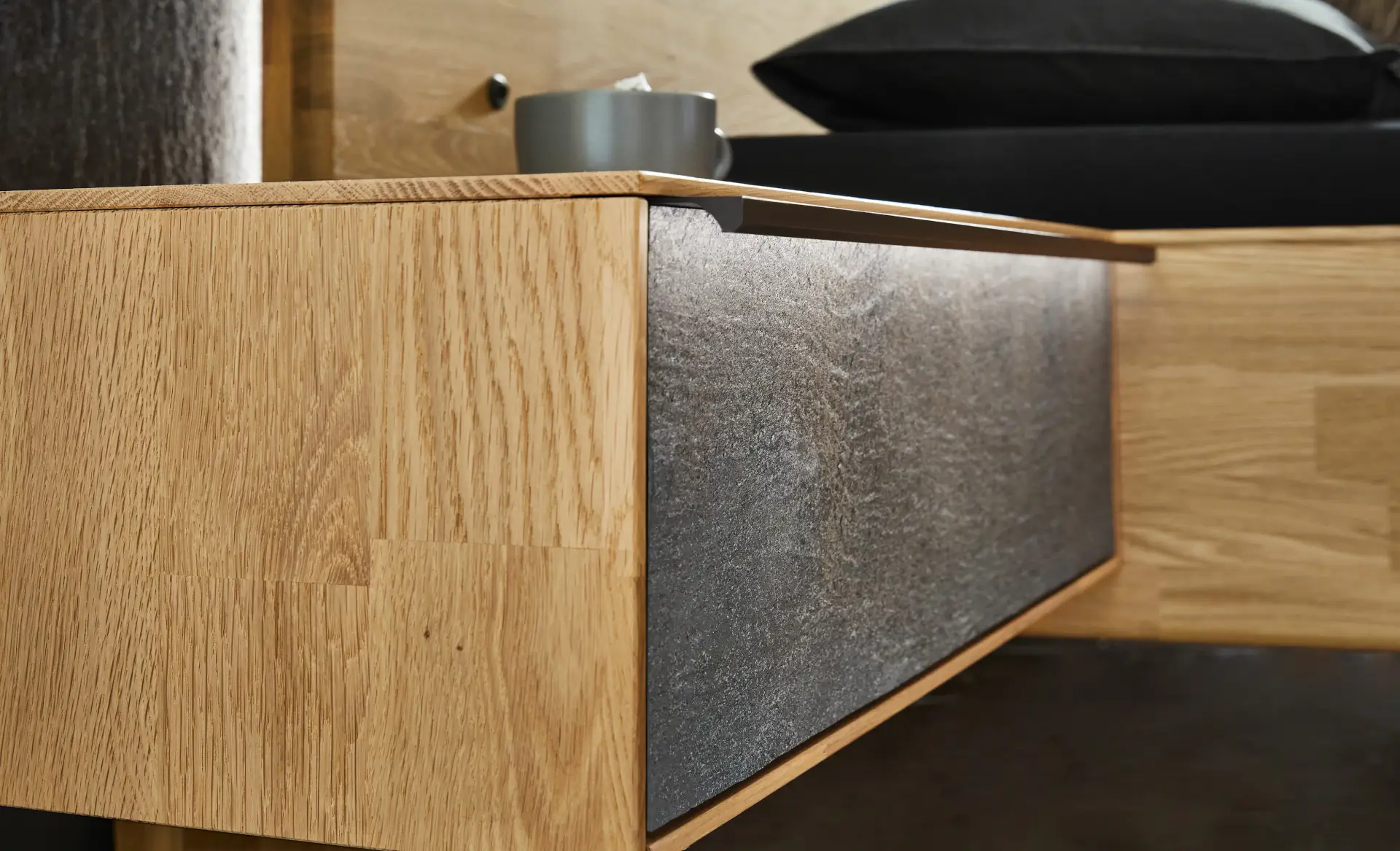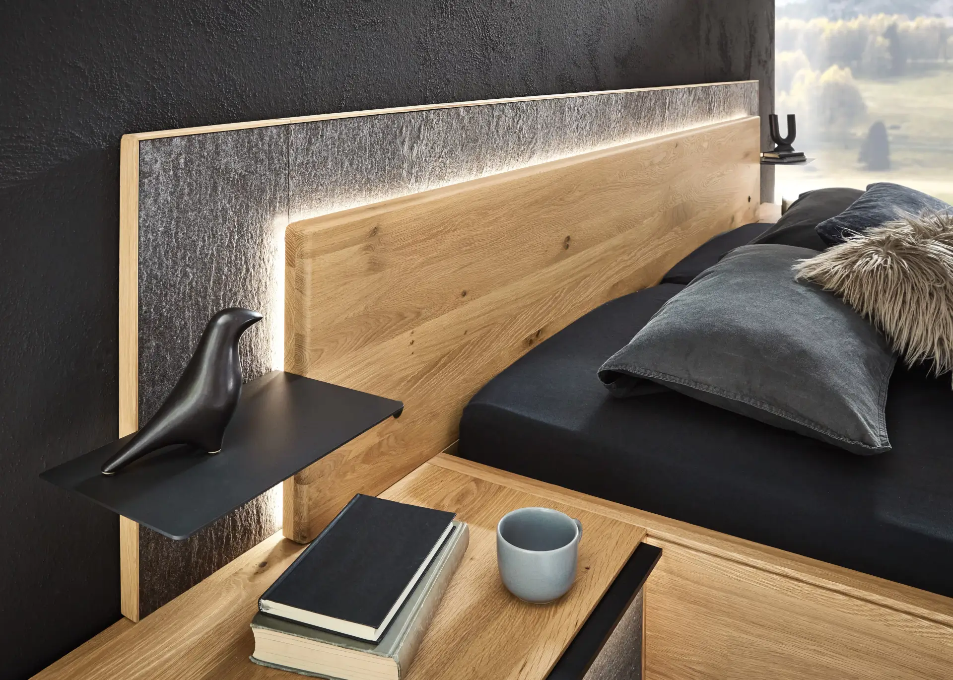 Dieses Massivholz-Schlafzimmer ist ein Rückzugsort zum Verweilen und Entspannen. Lassen Sie sich von der warmen Ausstrahlung der massiven Wildeiche und den echten Natur-Details inspirieren! Die ausdrucksstarken Steinfurnier-Akzente setzen einzigartige Highlights, die Ihrem Schlafzimmer eine echte Portion Natur verleihen. Entstehend aus echten Schieferblöcken, überzeugt der Akzent durch seine individuellen Strukturen und Farbvarianten. Die Herstellung erfolgt durch das Abspalten von Steinoberflächen, die rückseitig mit GFK-Trägern verstärkt werden. Jeder Akzent ist ein Unikat. Und das Beste? Die clever eingebauten LED-Highlights, an den Griffen und der Kopfteilumrandung, sorgen auf Wunsch für eine besonders gemütliche Atmosphäre.