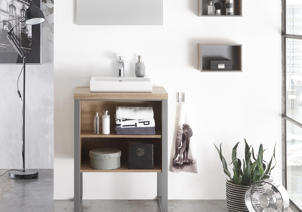 Im topmodernen Industrial Look designt, werden verschiedene Front- und Korpusdekore kombiniert mit prägnanten Füßen und Griffen aus Metall.