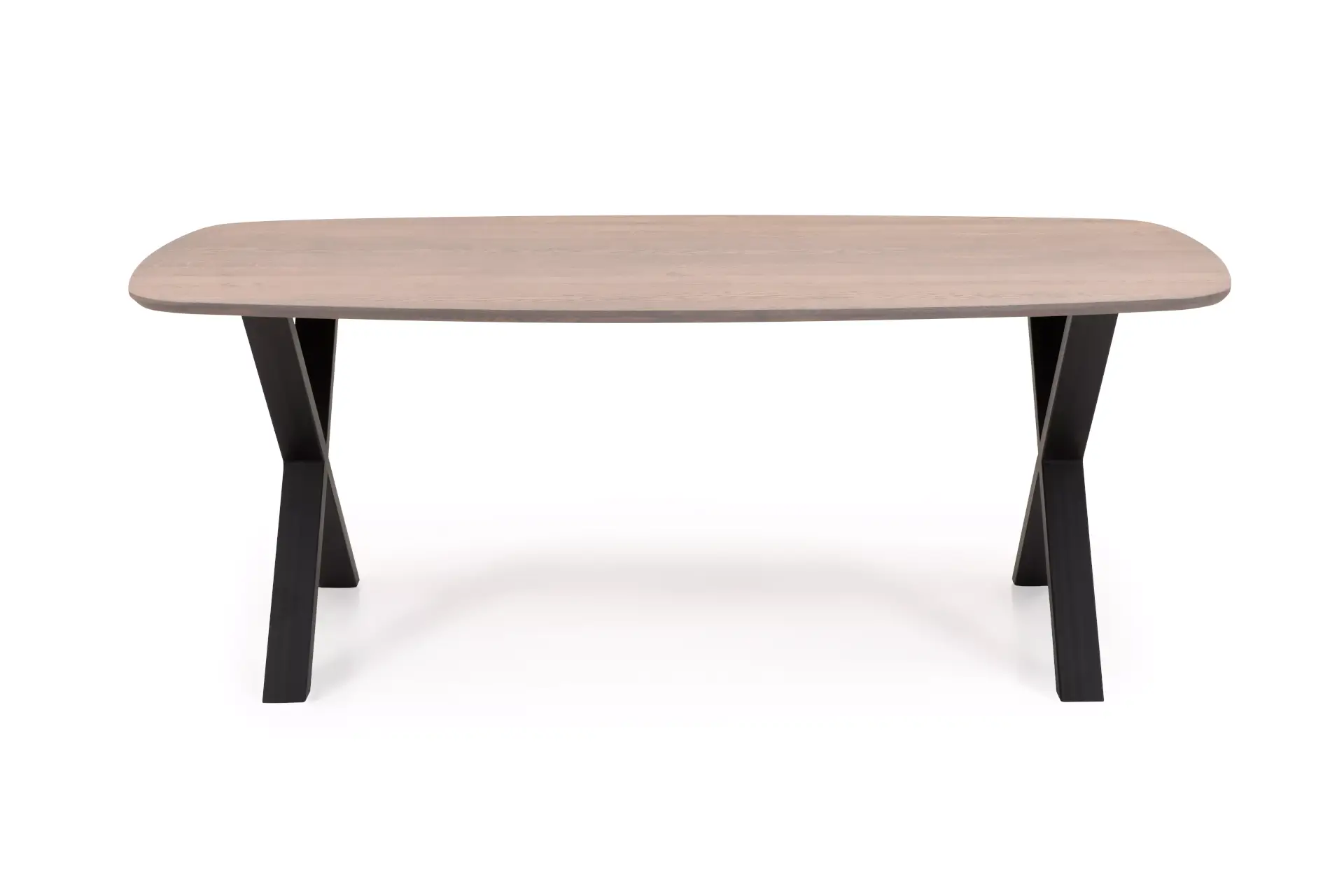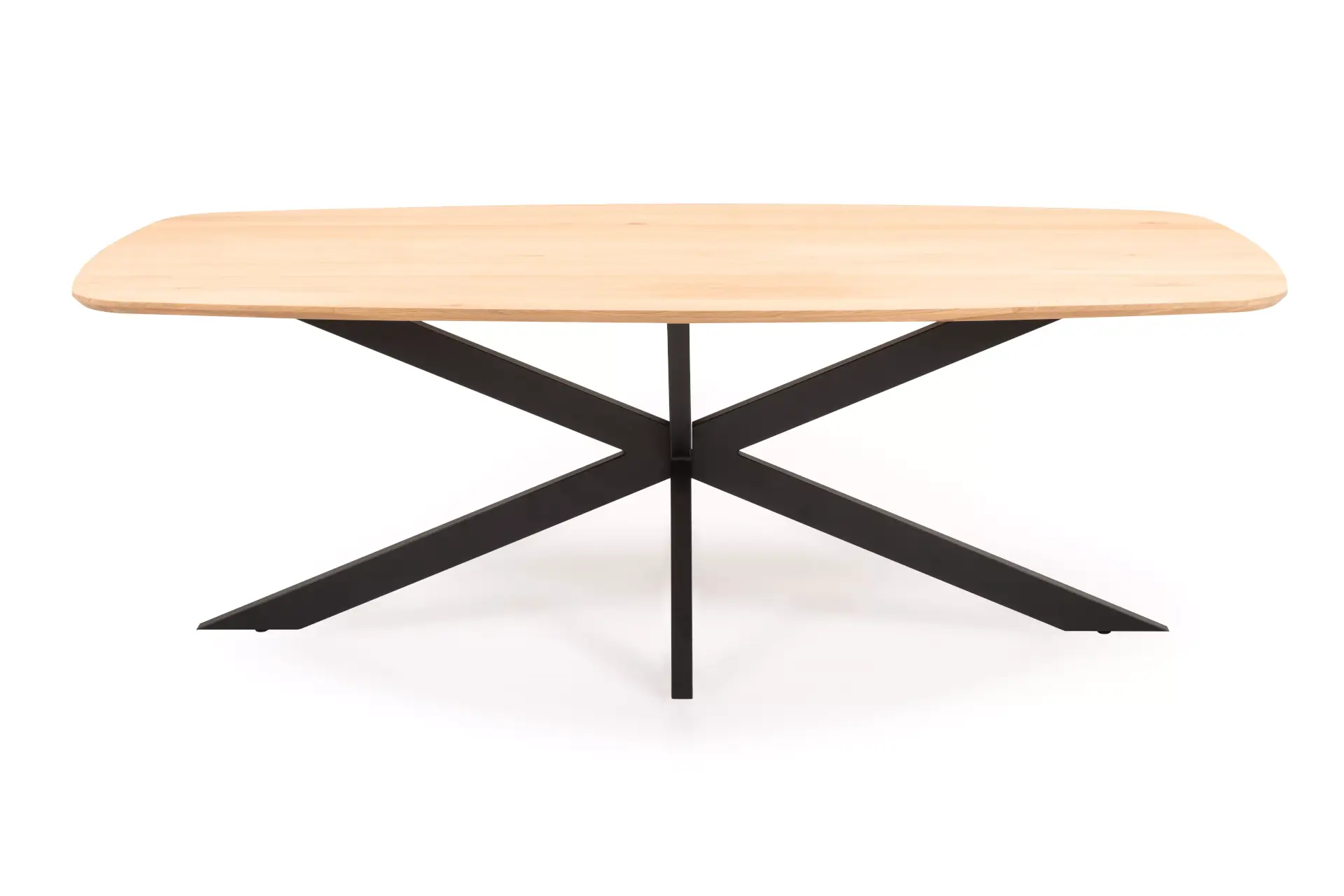 Ausziehbarer Tisch in verschiedenen Massiv-Holz-Farben und einem schwarzen Metallgestell.