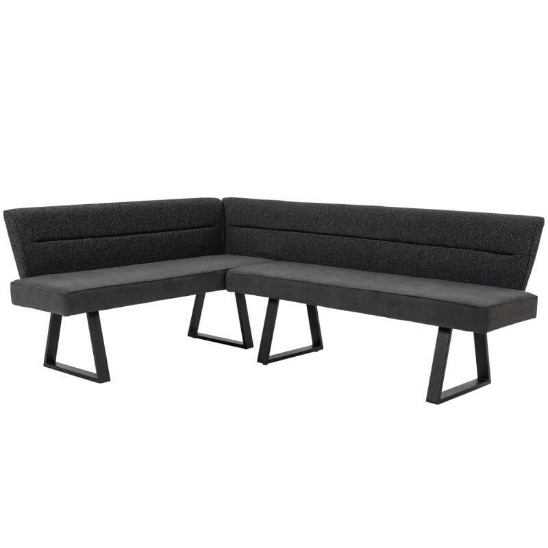 Gepolsterte Eckbank mit Webstoff 136 und Mikrofaserstoff 109 und einem Gestell in Metall schwarz. Maße: 159 x 212 cm, Sitzbreite 146 / 198 cm und Sitzhöhe 48 cm.