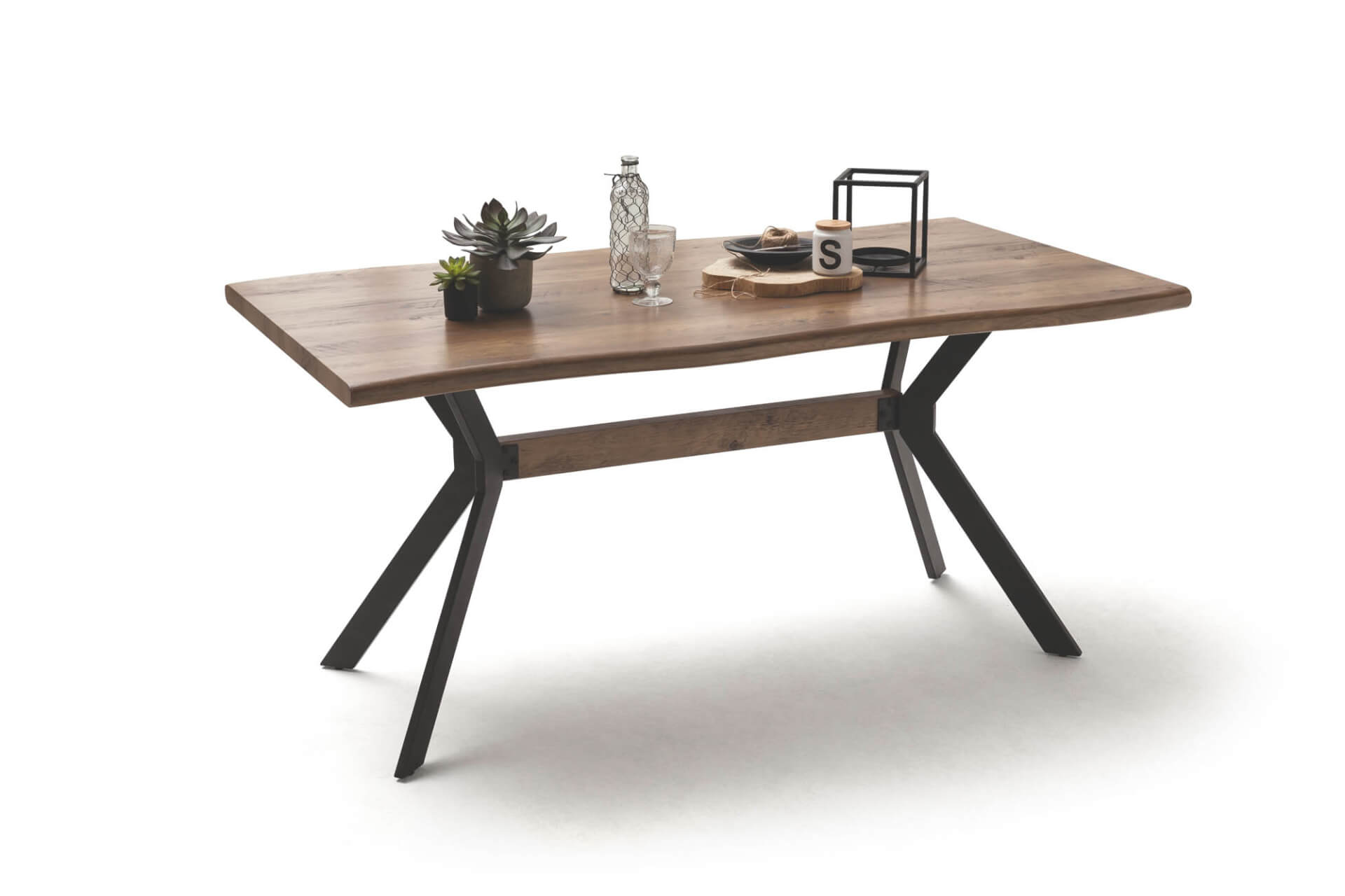 4-Fuß-Tisch mit einer Tischplatte in MDF foliert, Wildeiche Antik Nachbildung, Baumkante abgerundet. Ein Gestell in Kantrohr schwarz matt lackiert rundet diesen formvollendeten Tisch ab. Beachten Sie unseren Typenplan!