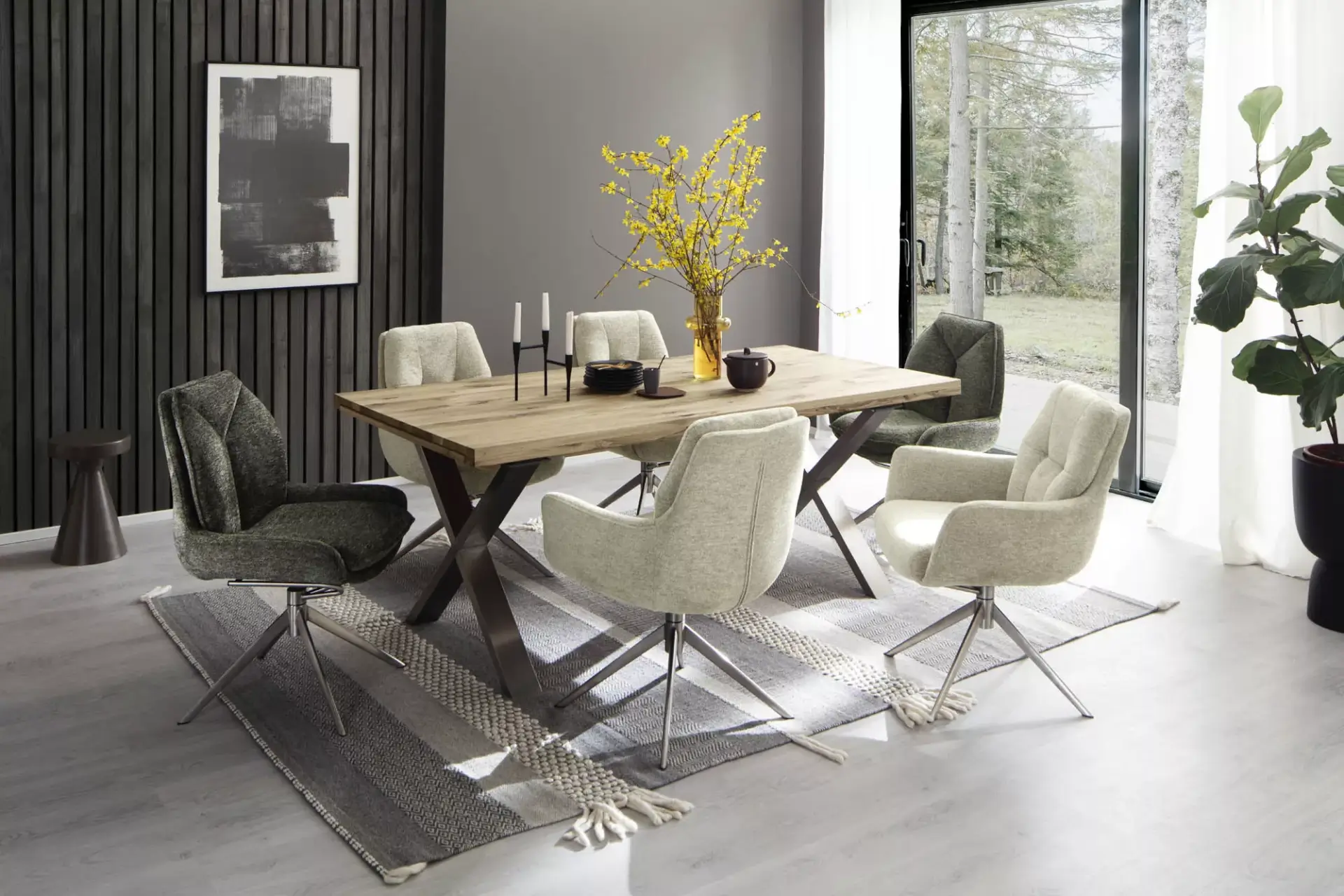 Das Brooklyn-Tischsystem besteht aus einer 50 mm dicken, aufgedoppelten Tischplatte aus Ast-Balkeneiche. Erhältlich in der Ausführung Wildeiche oder Eiche Bianco geölt. Synchronauszug Butterfly 100 cm ist standardmäßig erhältlich. Auch beim Gestell können Sie zwischen Stahl anthrazit lackiert oder Edelstahl gebürstet wählen.