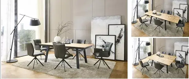 Massivholz-Funktionstisch "Doppio", 2 innen liegende Verlängerungsplatten, sowohl in Längsrichtung 200 – auf 250 bzw. 300 cm als auch in der Breite 100 – auf 150 cm verlängerbar, einfach in der Bedienung, Gestell Metall schwarz, incl. Höhenversteller. Platte Charaktereiche massiv, Oberfläche geölt