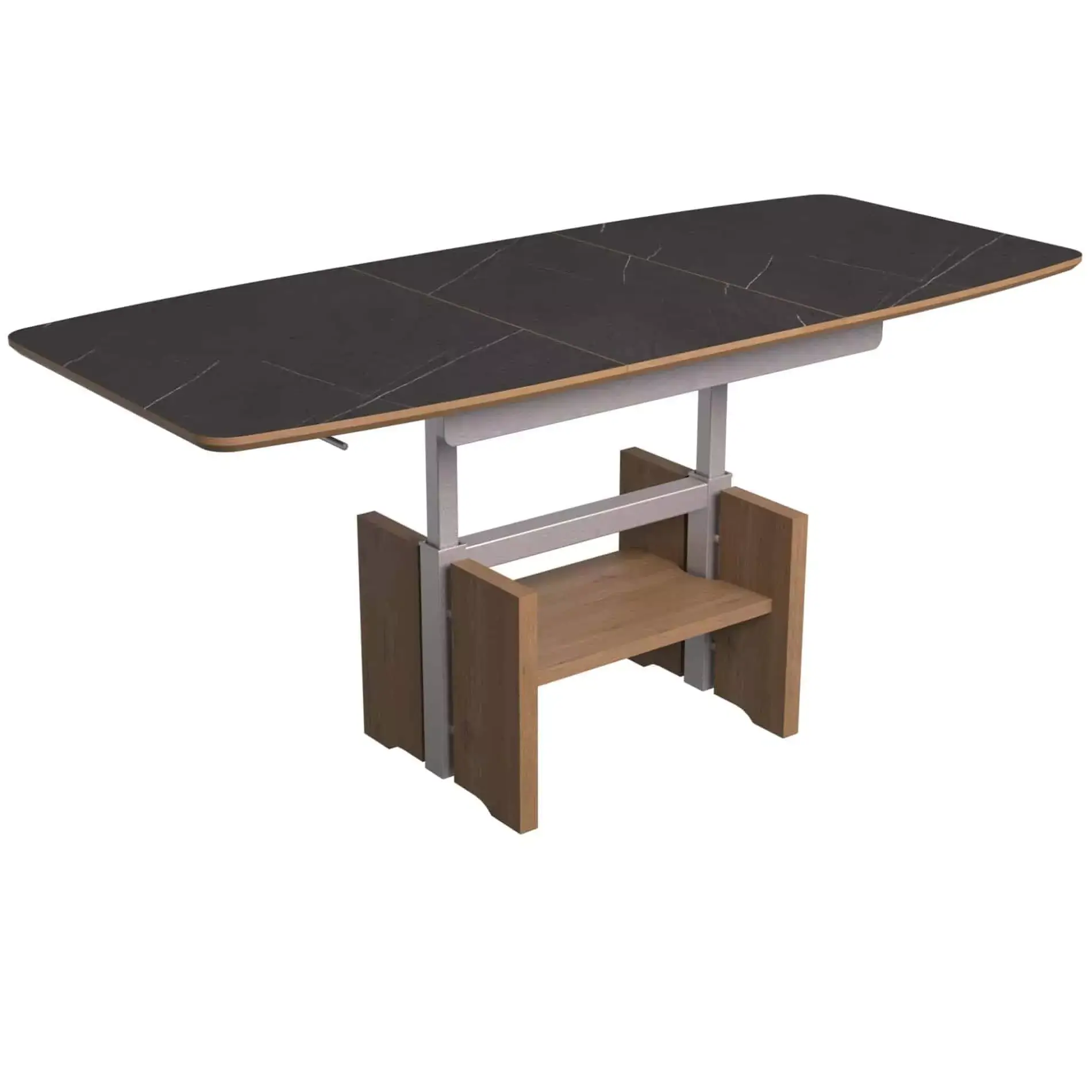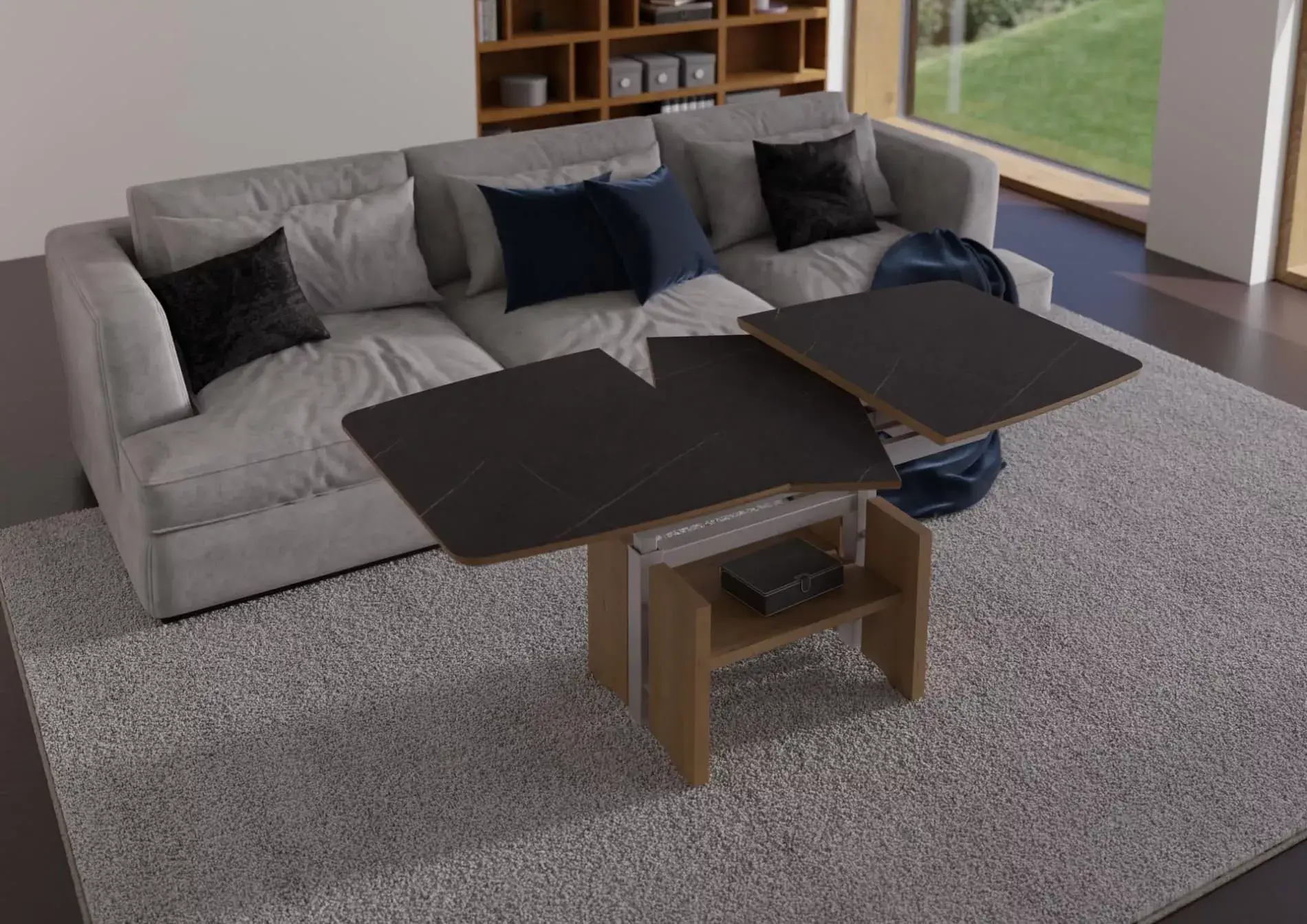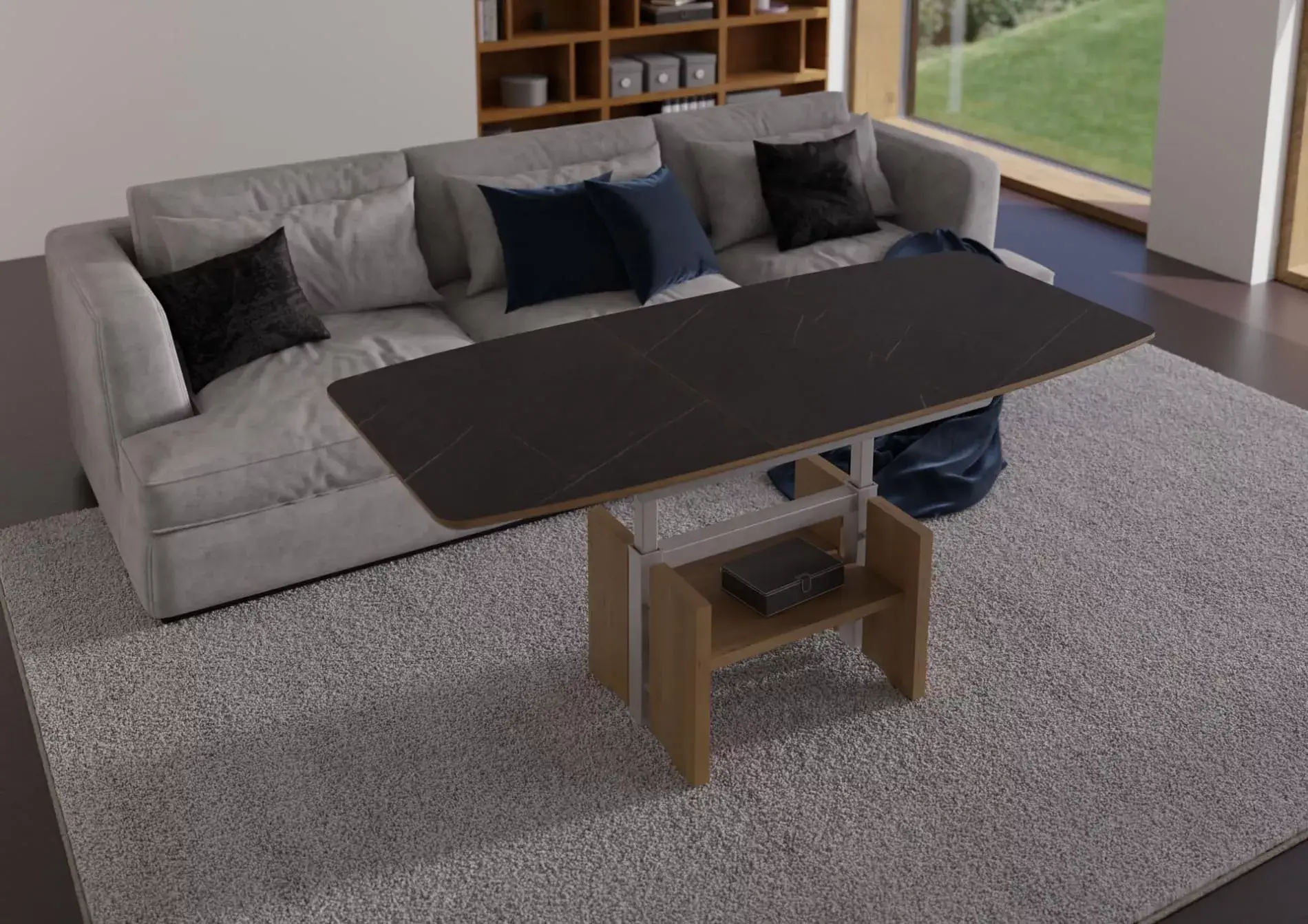 Couchtisch mit Tischplatte und Ilse Tornado Auszug, Marmara nero HPL-Auflage, MDF Trägerplatte, Gestell Ilse Lift Mechanik perlsilberfarbig lackiert, Wildeiche Echtholz furniert mit Ablage, Beizton Wildeiche bianco lackiert, B/H ca. 120(160)/54-73/70 cm.