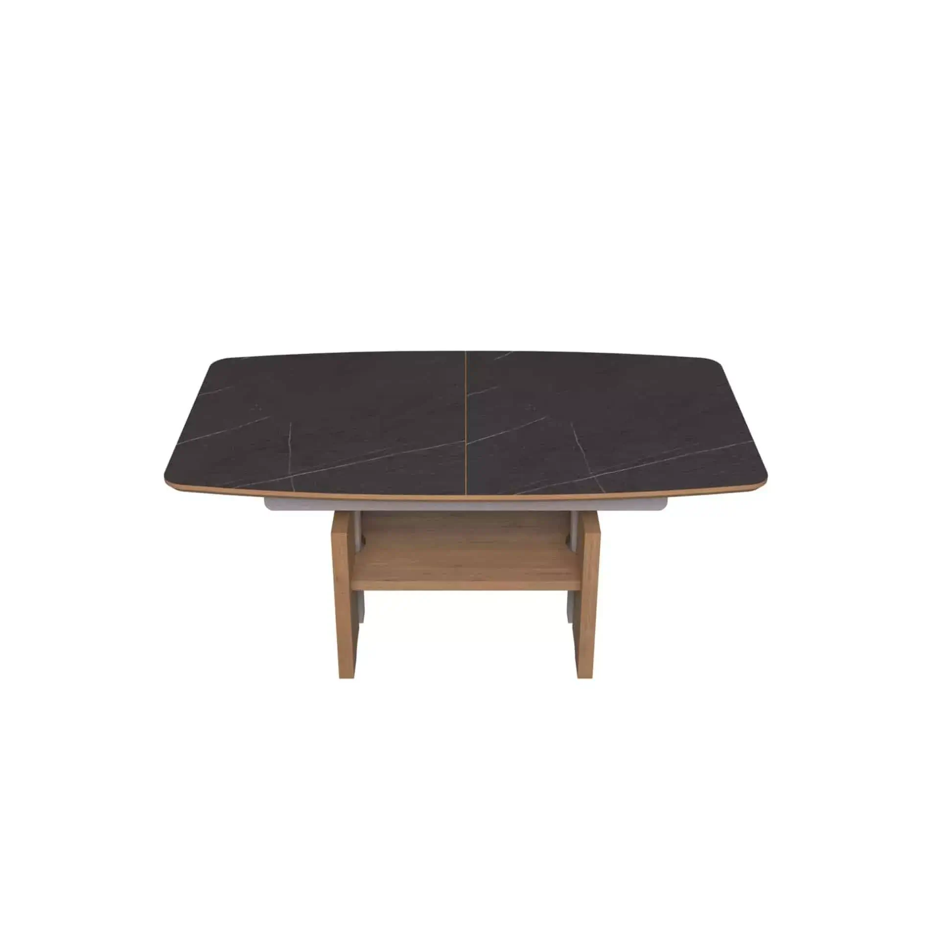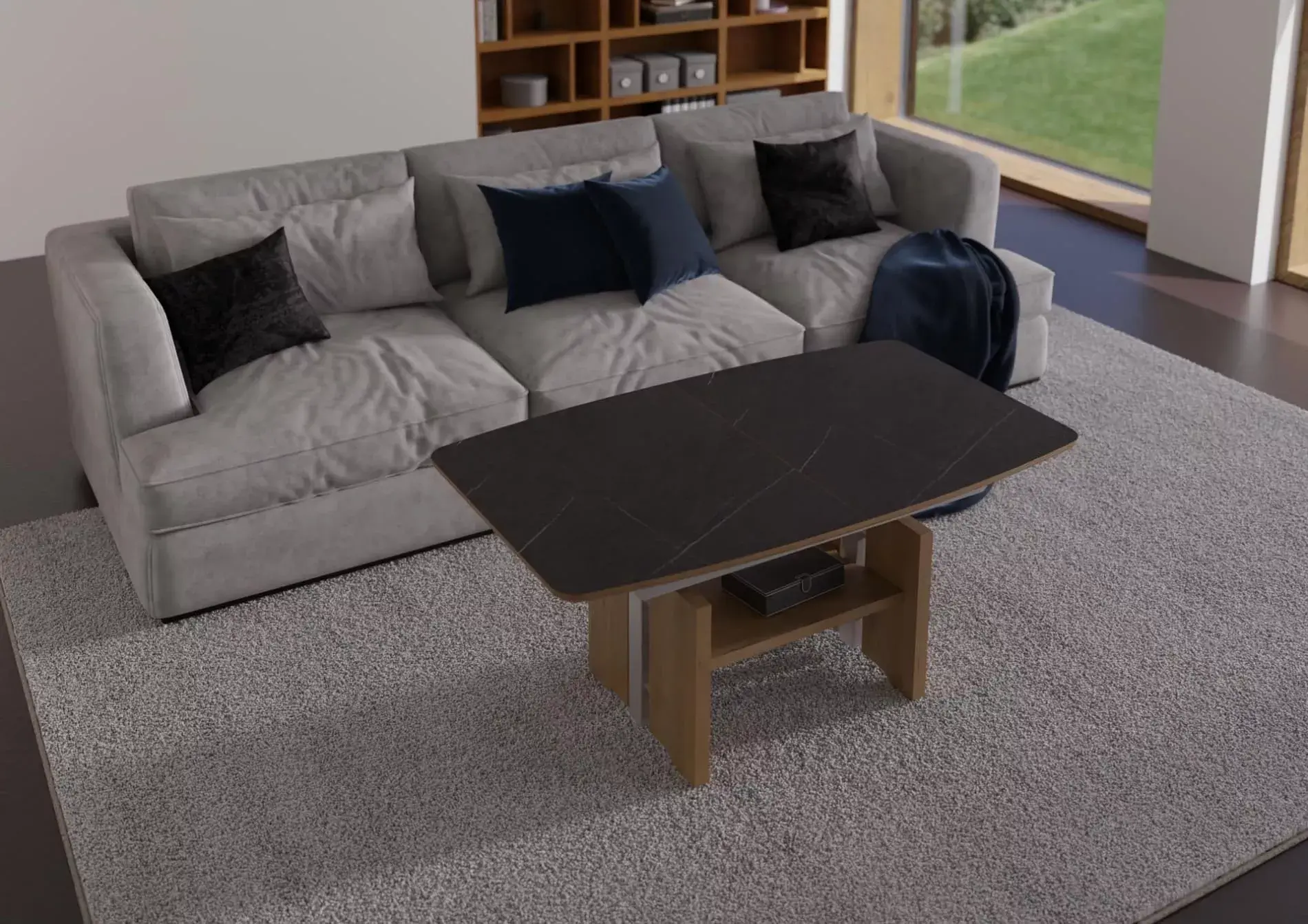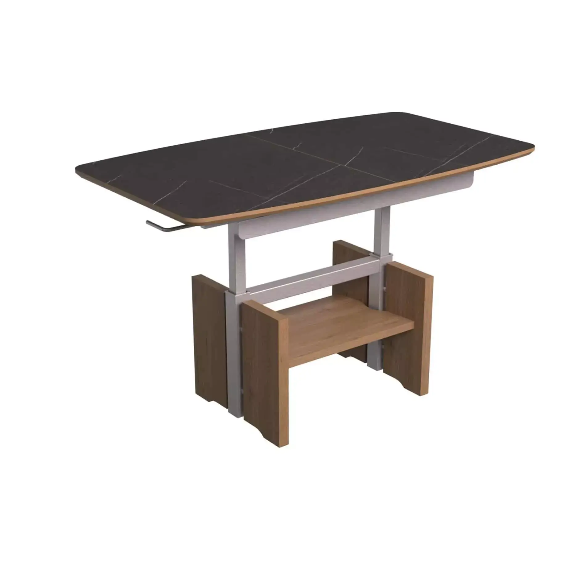 Couchtisch mit Tischplatte und Ilse Tornado Auszug, Marmara nero HPL-Auflage, MDF Trägerplatte, Gestell Ilse Lift Mechanik perlsilberfarbig lackiert, Wildeiche Echtholz furniert mit Ablage, Beizton Wildeiche bianco lackiert, B/H ca. 120(160)/54-73/70 cm.