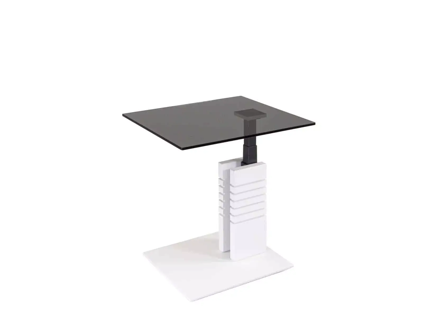 Platte Parsolgrau 10 mm (ESG), Gestell Illse Hydro Lift Mechanik, Liftsäulenverkleidung Wildeiche massivholz, Bodenplatte Wildeiche furniert, Metallteile anthrazit metallic lackiert, Rollen, Beizton Parsolglas grau/wildeiche bianco lackiert, BHT ca. 55/47-65/47 cm