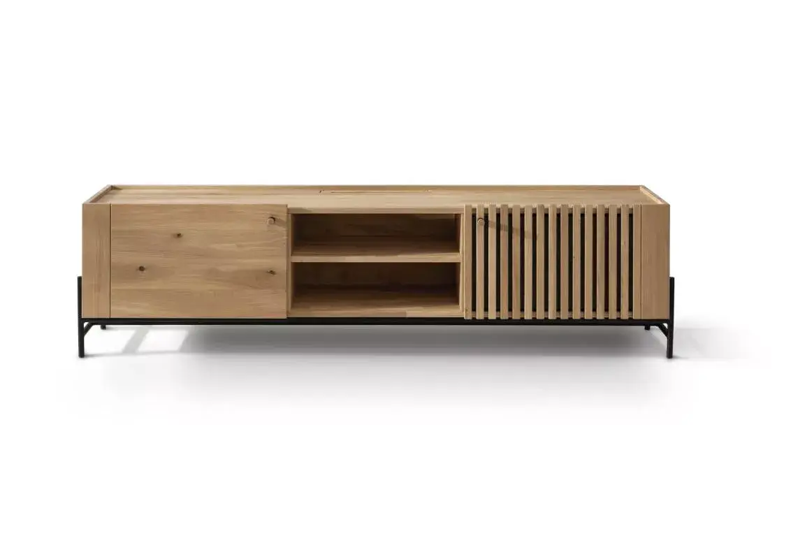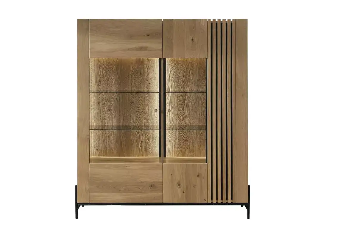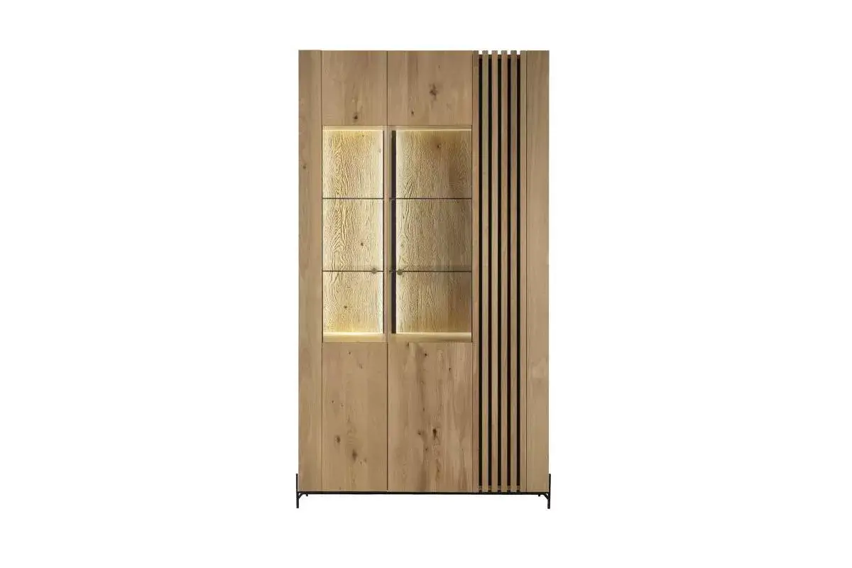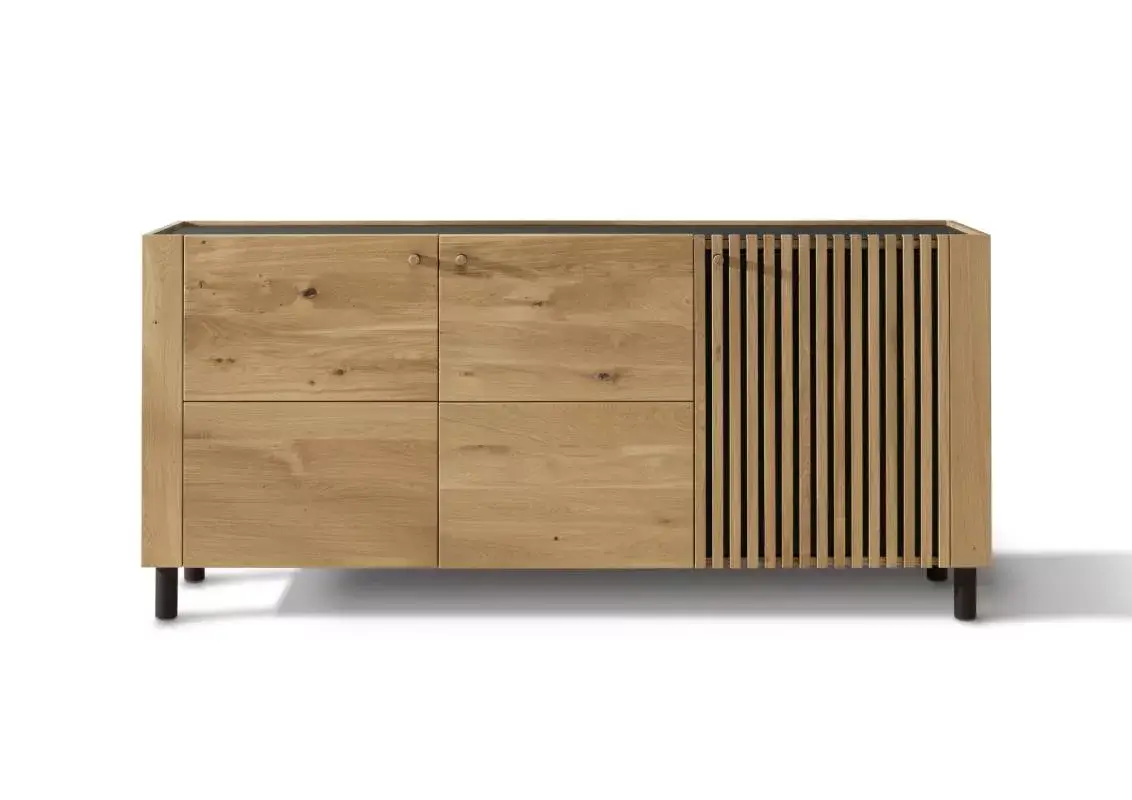 ASCONA, neu interpretiert. Wie gewohnt in Wildeiche mit natürlicher Oberfläche. Details in der individuellen Ausführung machen alle Ascona Einzeltypen zu einem Highlight jeder Einrichtung. Trotz der ausladenden Optik sorgt die Rillenfront für optisch und gestalterisch schlanke Elemente, die viel Stauraum bieten. Unterschiedliche Griff formen, Untergestelle und Rückwände sowie Inlays in den oberen Böden sorgen neben der optional erhältlichen Beleuchtung für einzigartige und individuelle Möbelstücke. Zudem wird die Beleuchtung über einen von außen unsichtbaren Sensor-Lichtschalter gesteuert.