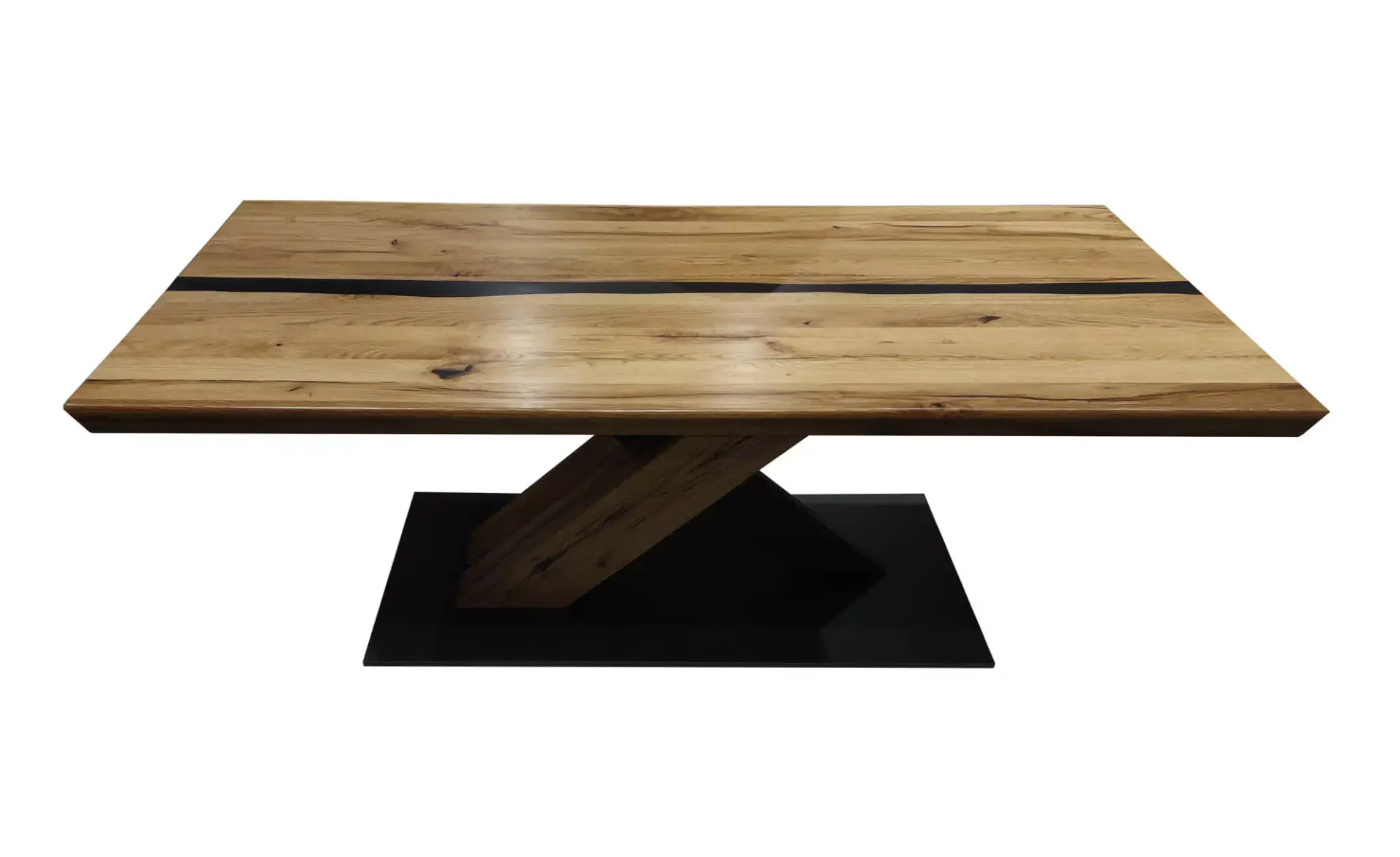 Camden, ein rechteckiger Couchtisch in Top Eiche massiv ( 40 mm ) mit schwarzer Resin-Einlage. Säule Eiche mit Resin + Metall. Bodenplatte schwarz MDF auf vier Rollen.