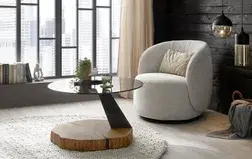 Couchtisch mit Tischplatte aus Top Glas grau und einer Säule in Metall schwarz uaf einer runden Bodenplatte in Eiche massiv und mit 5 Weichboden-Rollen.