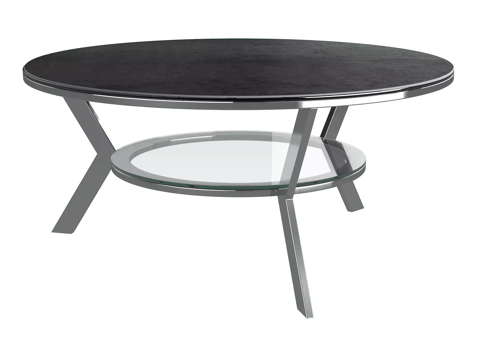 Dies ist Ellipse, ein Couchtisch von Akante. Hier ist die obere Keramikplatte in matter Marmoroptik mit einem Durchmesser von 90 cm und die untere Platte aus 10 mm starkem Temperglas. Das Gestell ist aus poliertem Edelstahl. Verschiedenste Gestellfarben und Tischfarben zeigt Ihnen unser Typenplan!