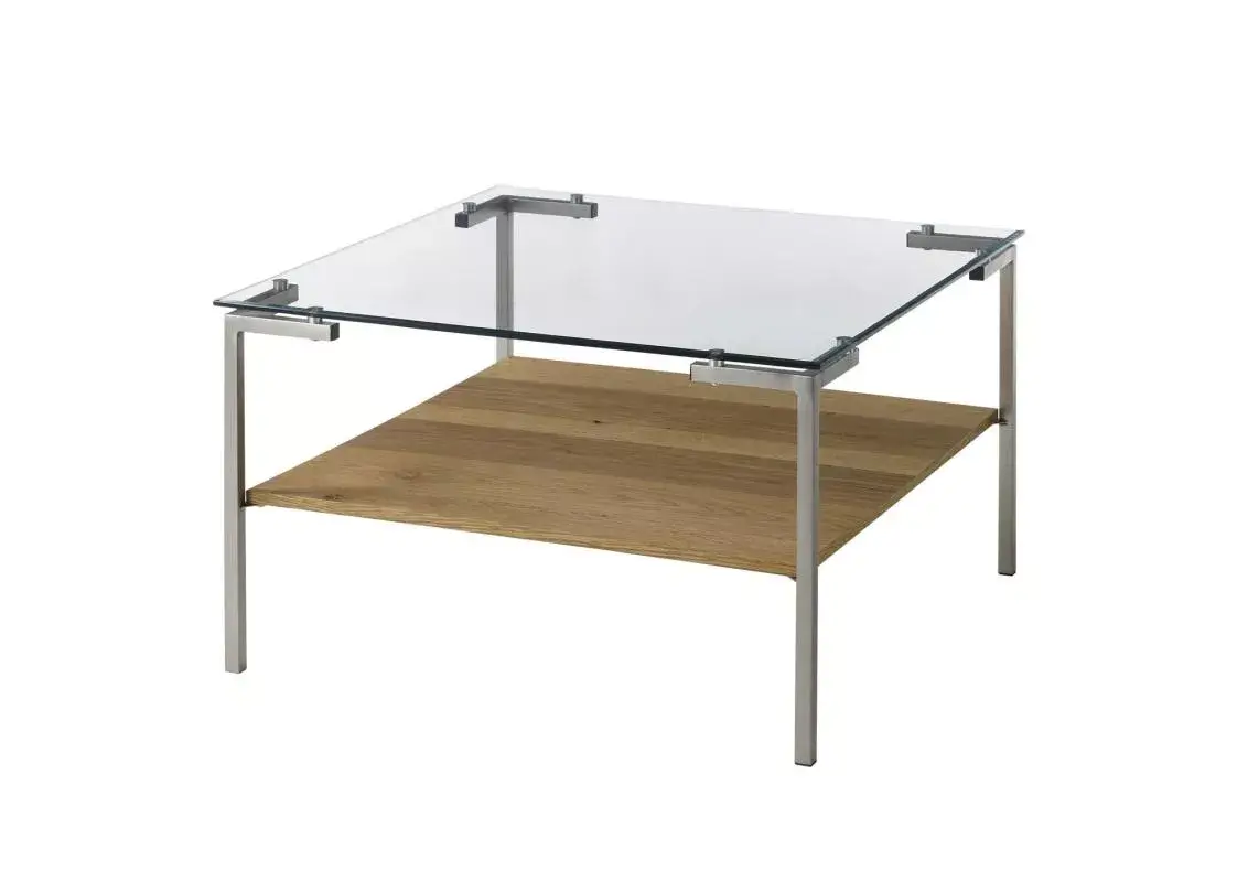 Glastisch GLASGOW mit Sicherheitsglas und einer Ablage in Eiche furniert HPW. Das Gestell ist aus Metall in Edelstahl-Optik.