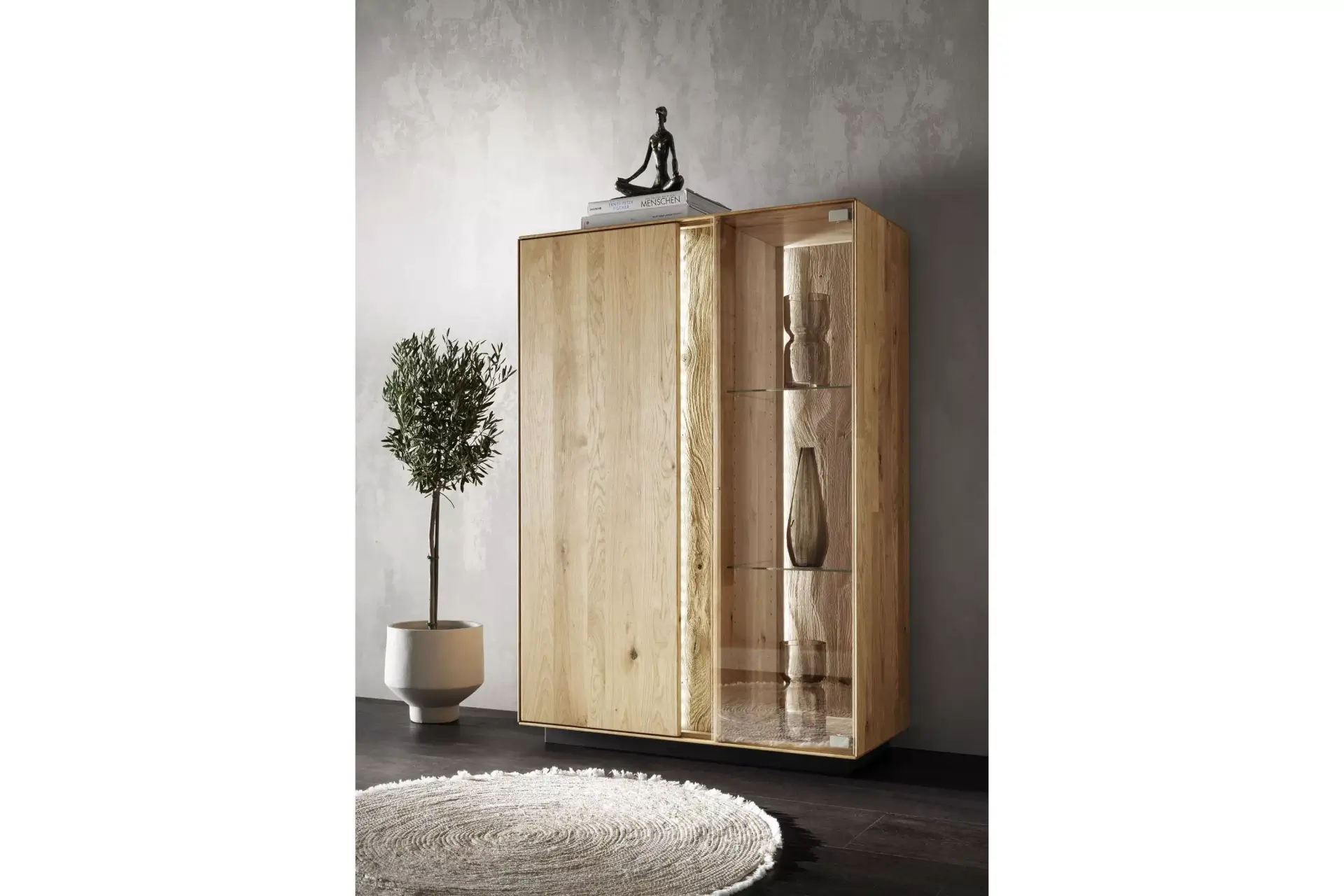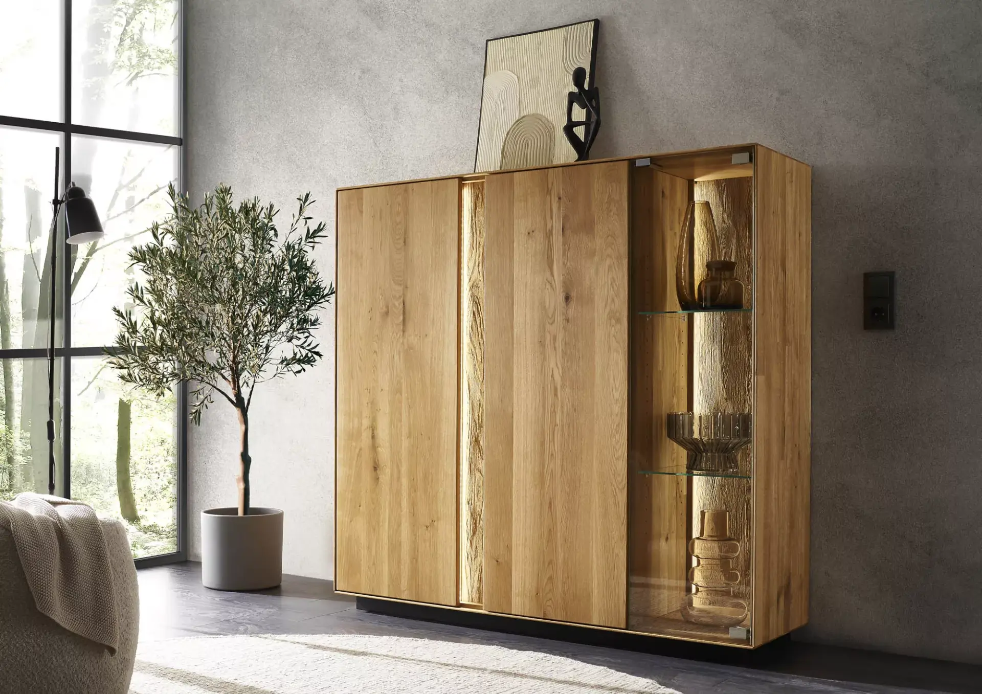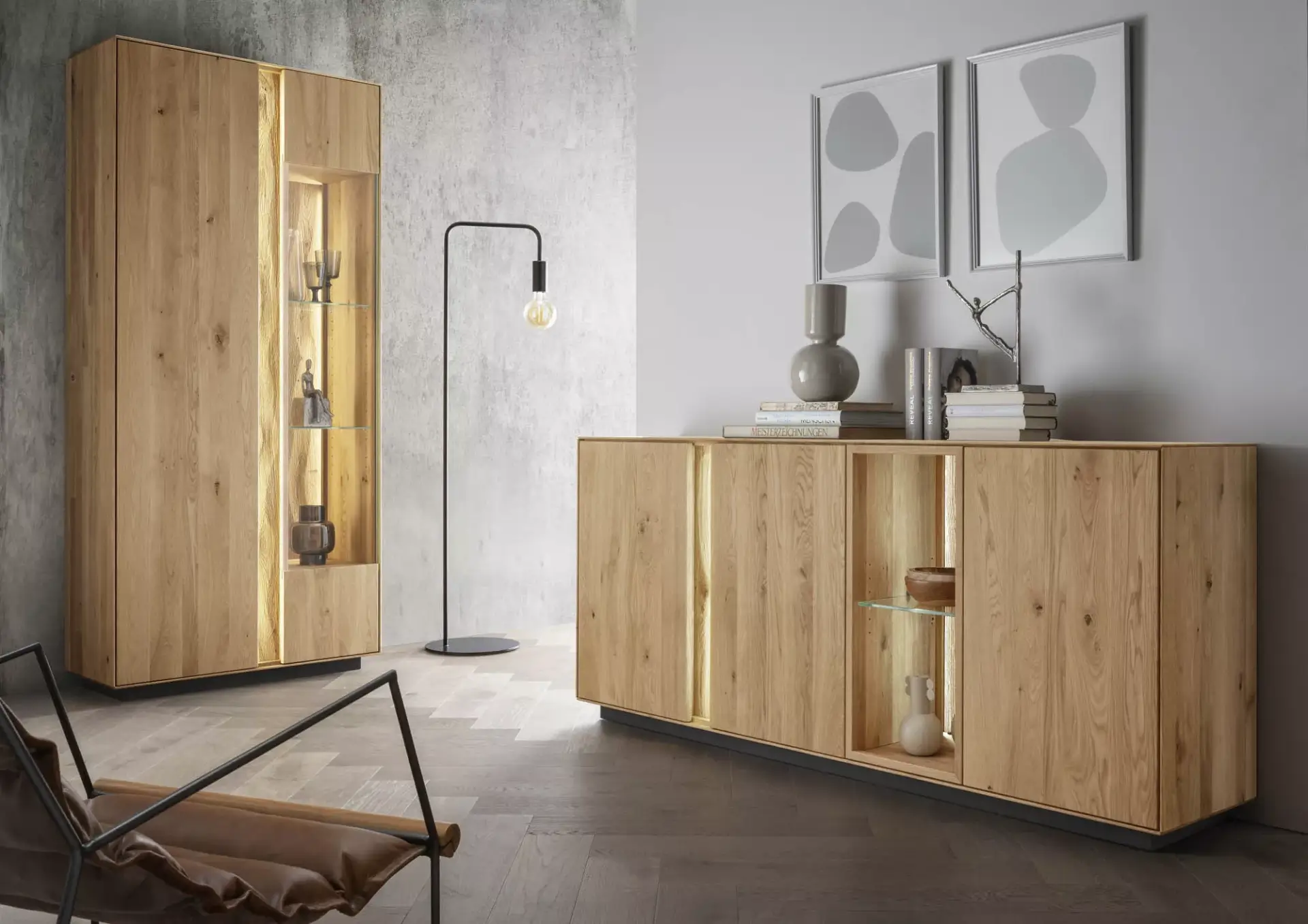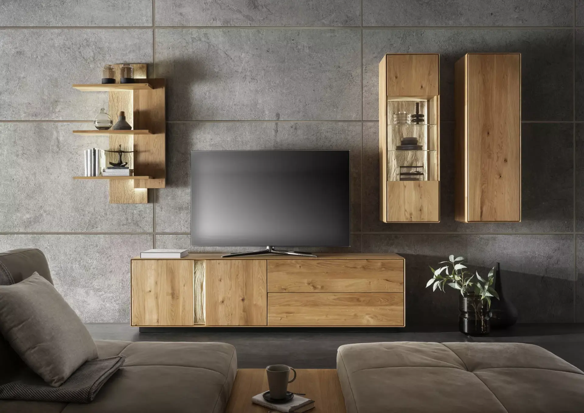 Dieses Wohnprogramm Lausanne kombiniert natürliche Materialien mit innovativer Lichtgestaltung. Die integrierte Beleuchtung hebt die sandgestrahlten Holzrückwände hervor und betont die einzigartige Struktur des Holzes, wodurch ein einladendes und harmonisches Ambiente