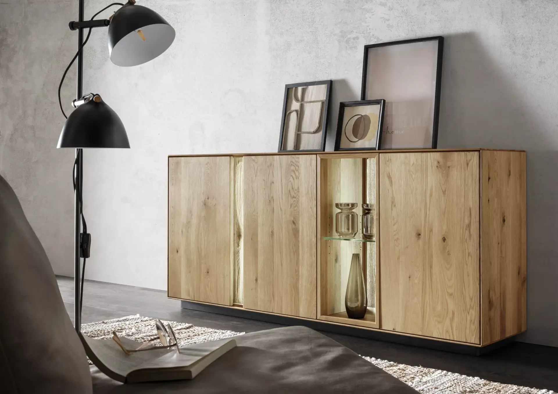 entsteht in echtes Highlight in jedem Raum. Im Mittelpunkt des Designs steht die perfekte Inszenierung von Massivholz und Lichteffekten in harmonisches Zusammenspiel zwischen der hauchdünnen Schattenfuge zwischen Deckenlatte und Seitenteil verleiht den Möbeln eine filigrane