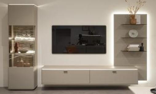 Wohnwand mit Front in Basalt Lacklaminat Membran verpresst Nachbildung und Korpus in basalt Melamin Nachbildung. Front und Seitenverglasung & Glasböden in Parsol braun.