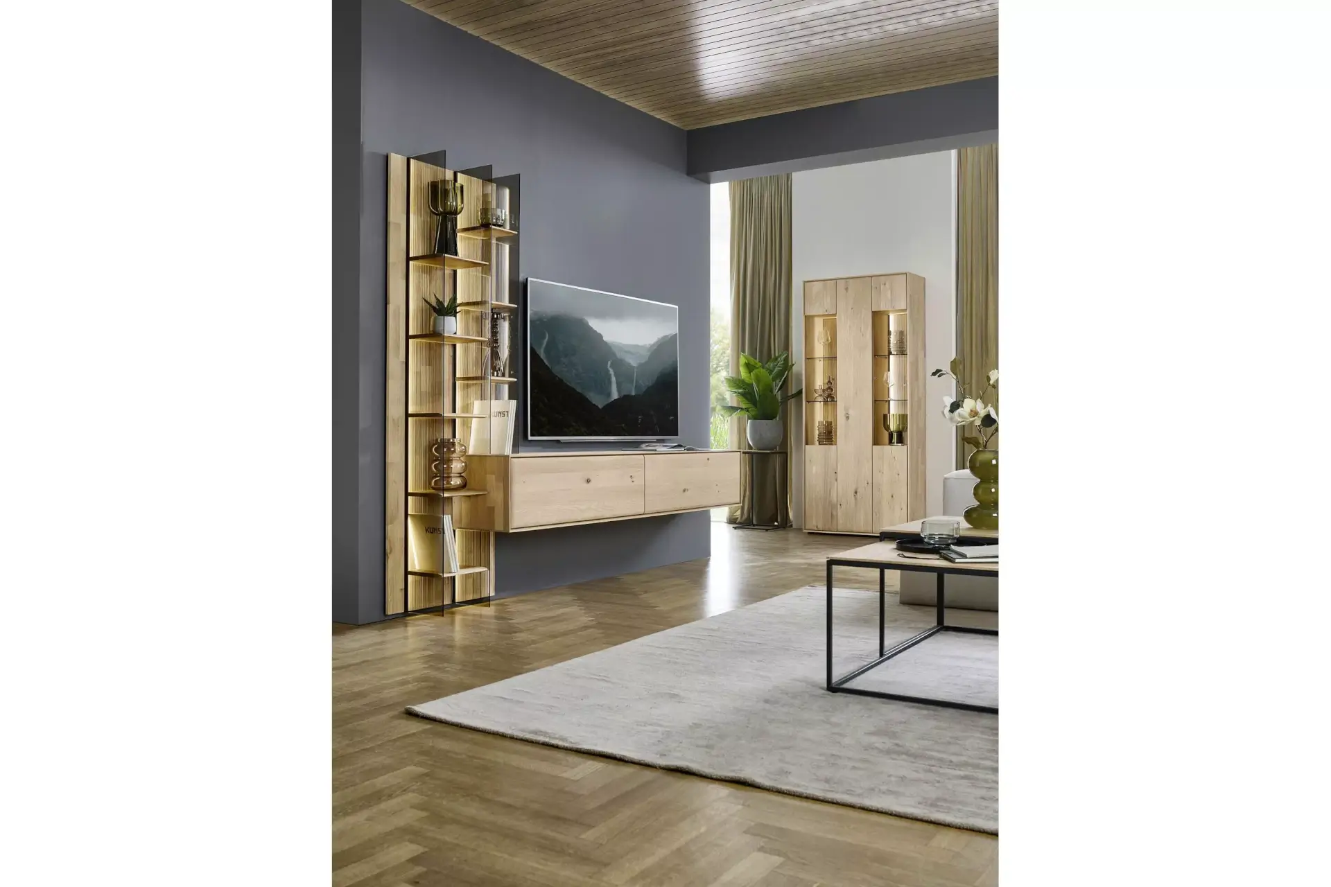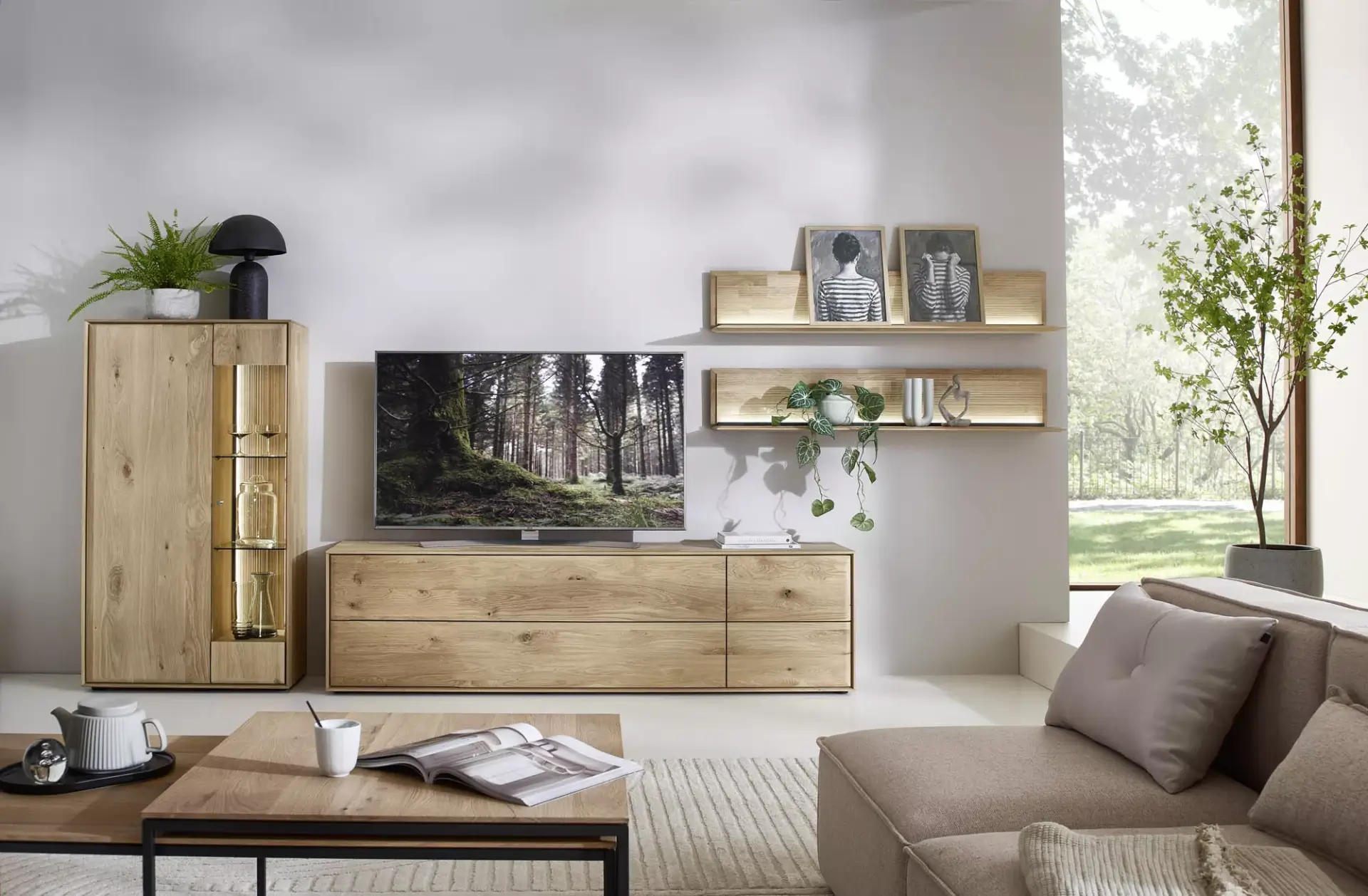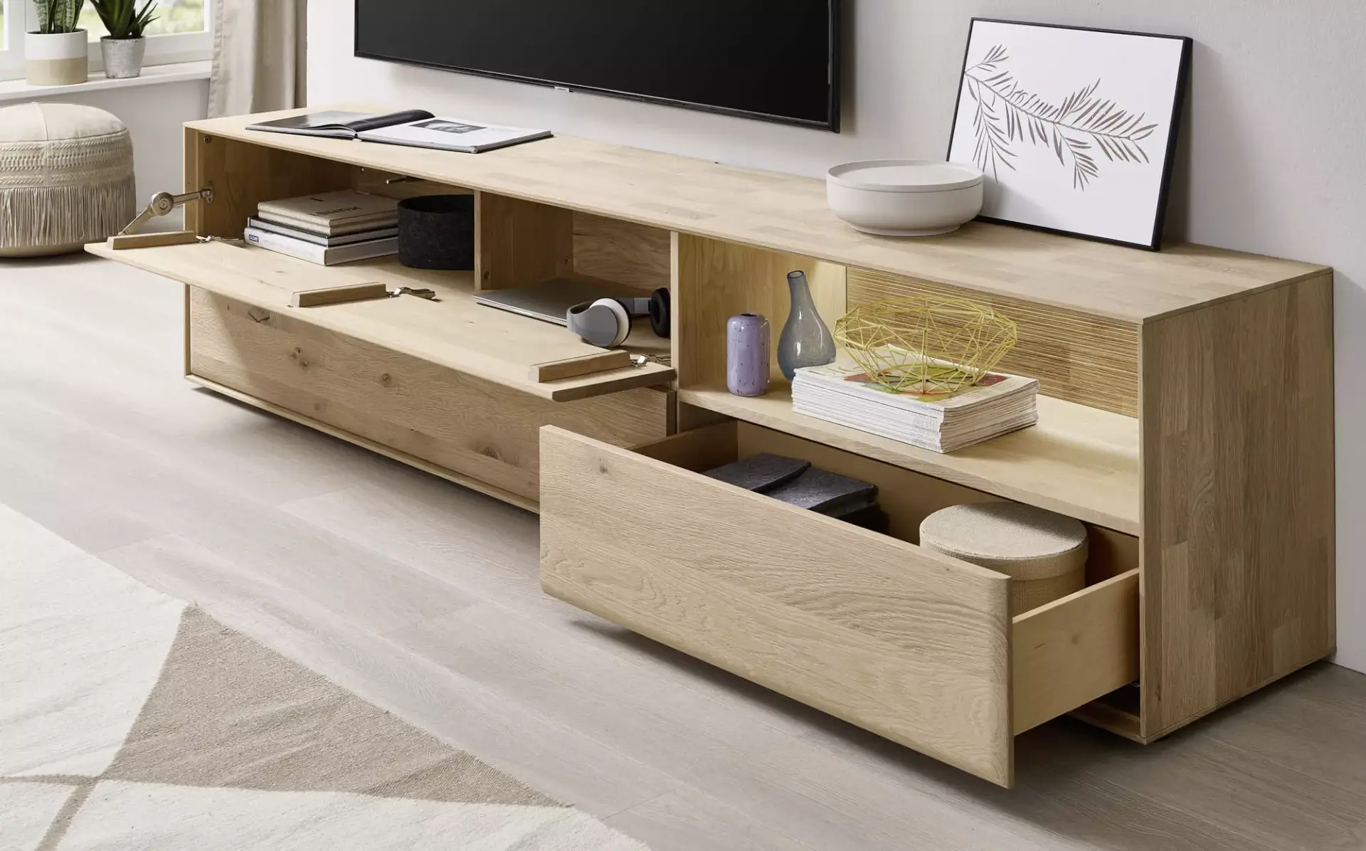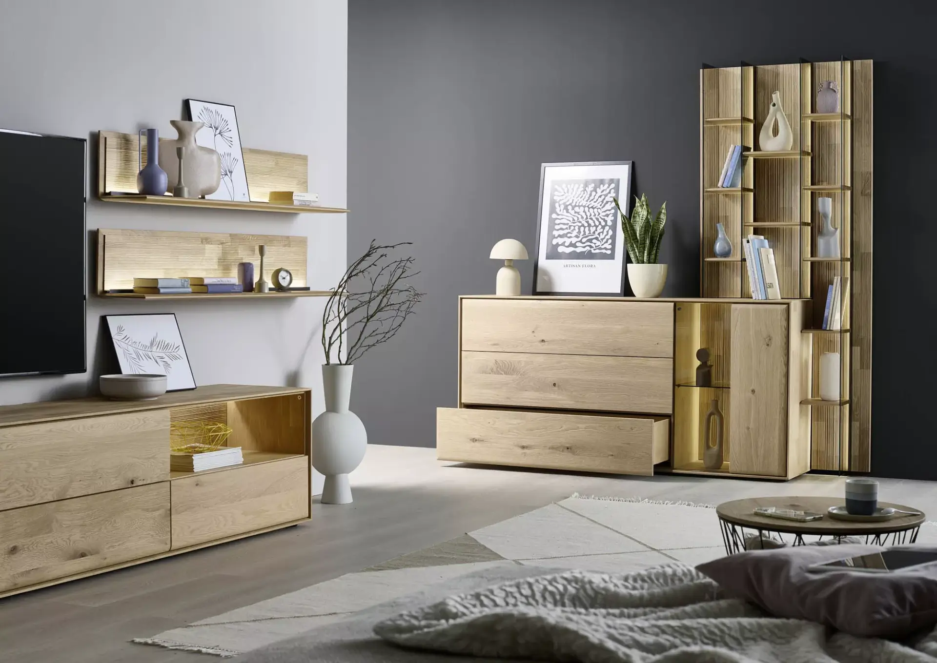 Passgenaue Möbel für Ihr Zuhause. Entdecken Sie dieses umfangreiche Programm in Kerneiche Natur massiv gebürstet mit geschroppter Rückwand. Erweiterbar auf ein komplettes Esszimmerprogramm.