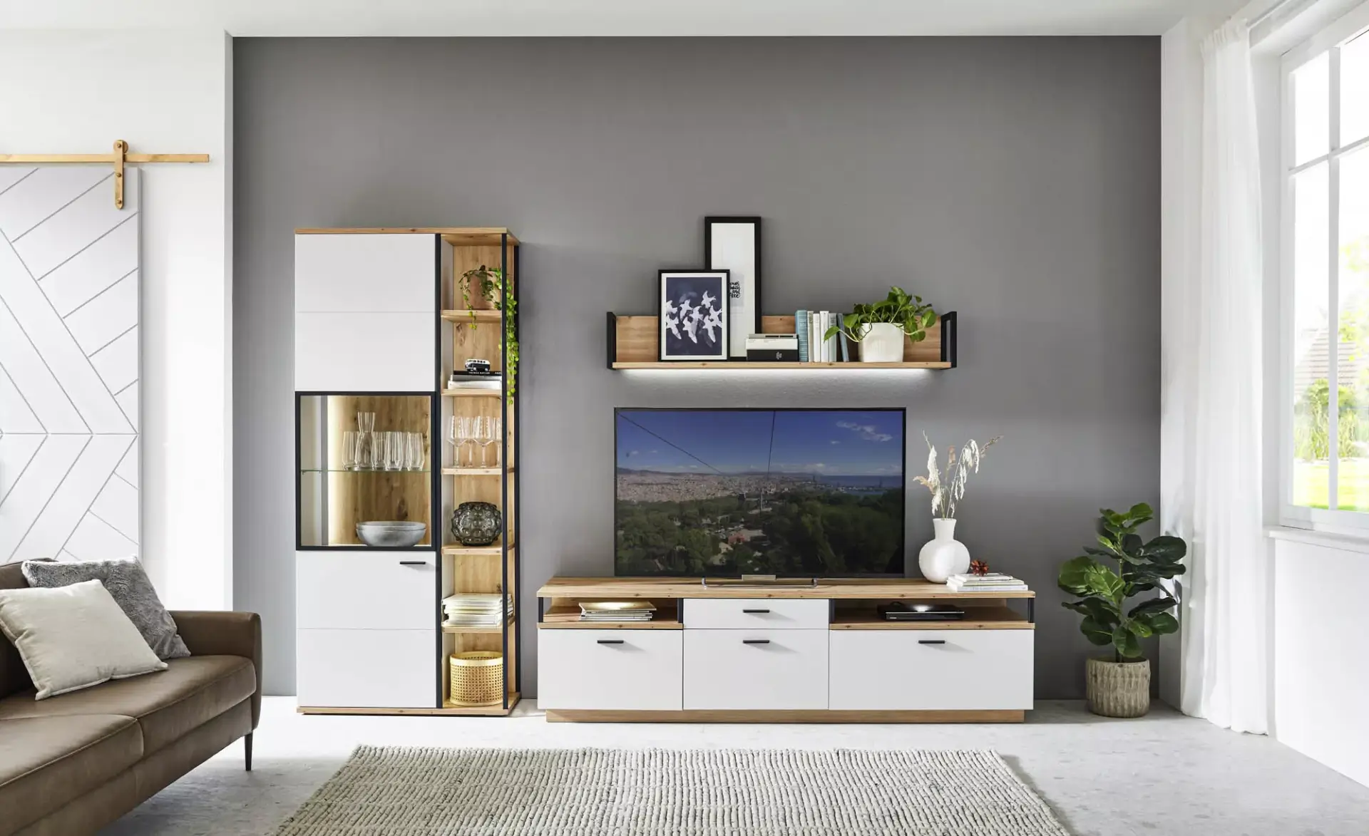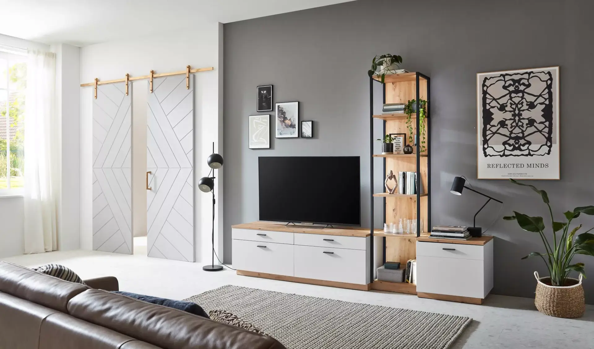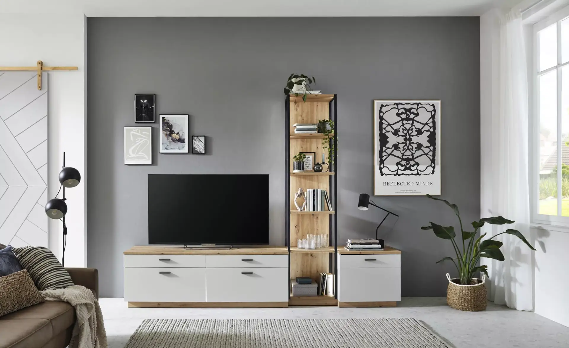 Trendige Wohnwand mit Front und Korpus in Modern White Melamin und mit Absetzungen in Eiche Artisan Melamin. Verschiedene Kombinationsmöglichkeiten zeigt Ihnen unser Typenplan!